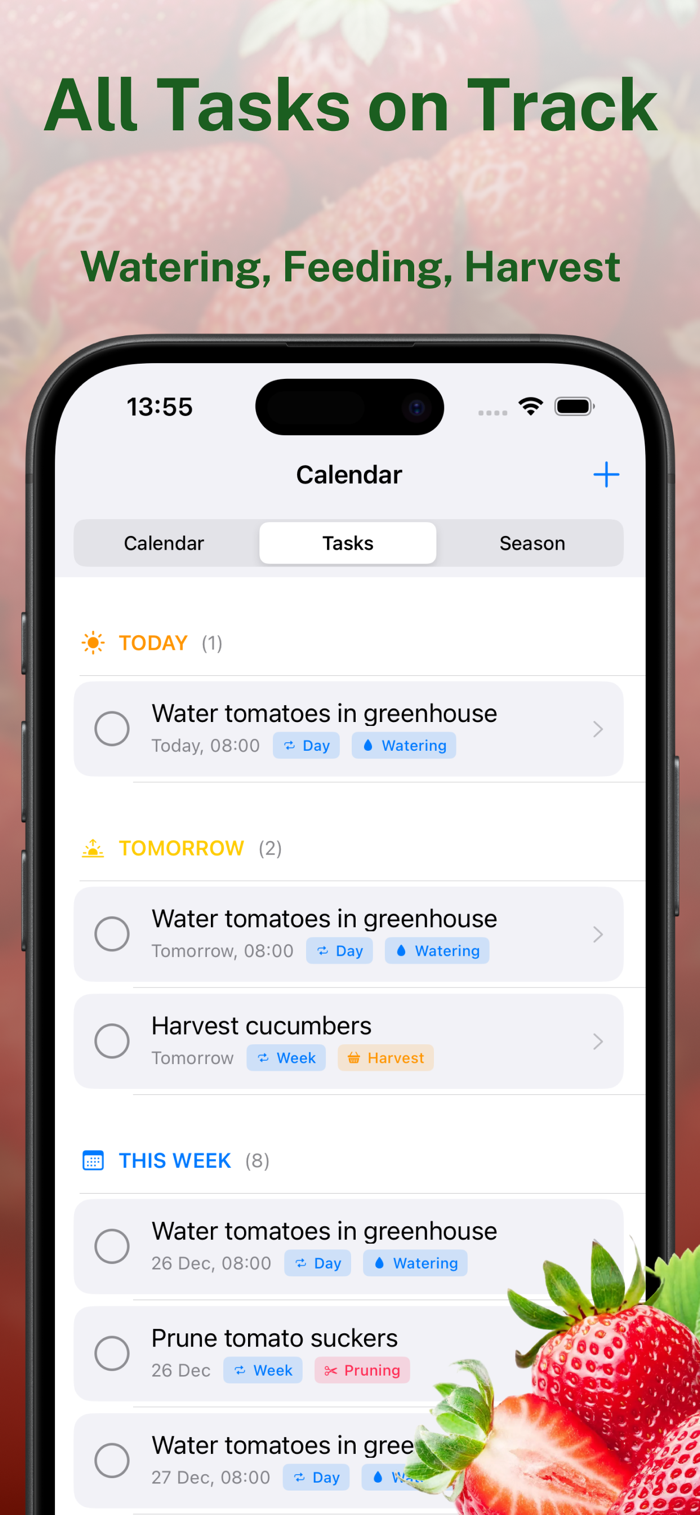 Create virtual garden beds and organize your plantings. Greenhouse, open ground, balcony — organize everything in one place.