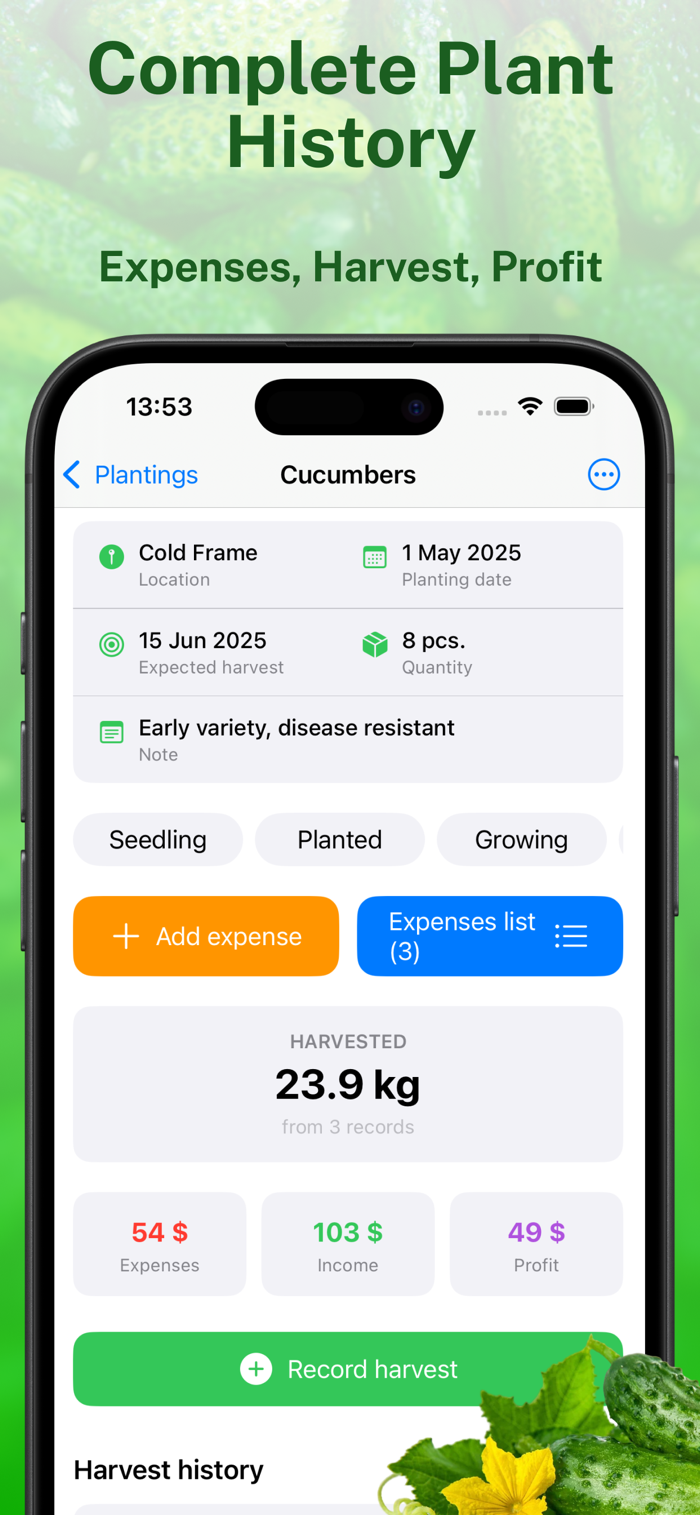 Record everything you plant: from tomatoes to radishes. Mark sowing dates, transplanting, and harvest times. Follow your plants' growth at every stage — from seed to plate.