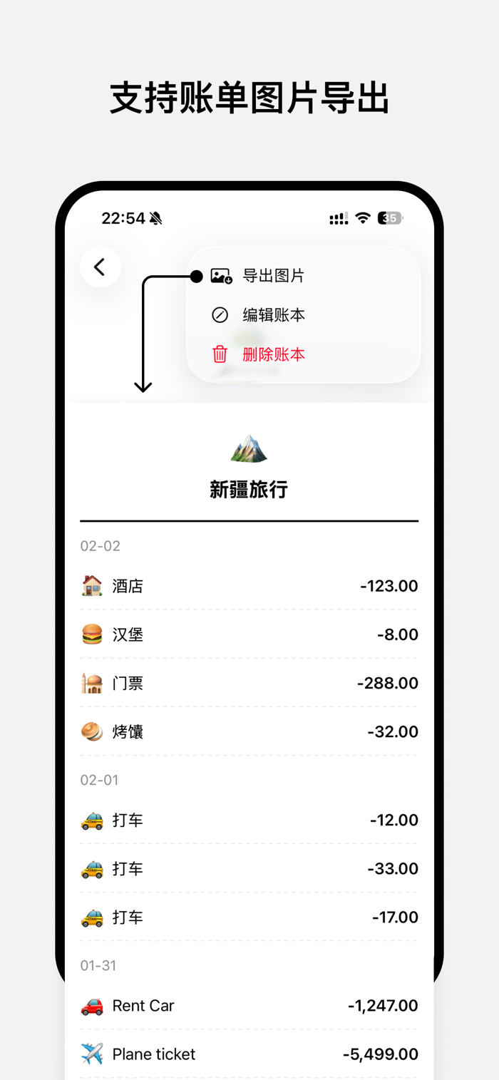 - 为不同场景创建专属账本:旅行、购物、日常开销...