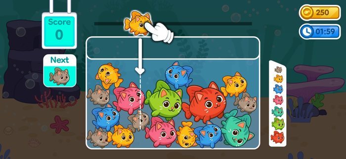 这款游戏提供丰富多彩的鲶鱼游戏,您可以与各种鱼类互动,从小型鲶鱼到活泼可爱的猫咪伙伴,应有尽有。游戏采用融合机制,您可以将鲶鱼和宠物组合起来,创造出更可爱、更独特的生物。猫咪融合和鲶鱼游戏机制将让您乐在其中,努力打造世界上最美丽、最多样化的水族馆。