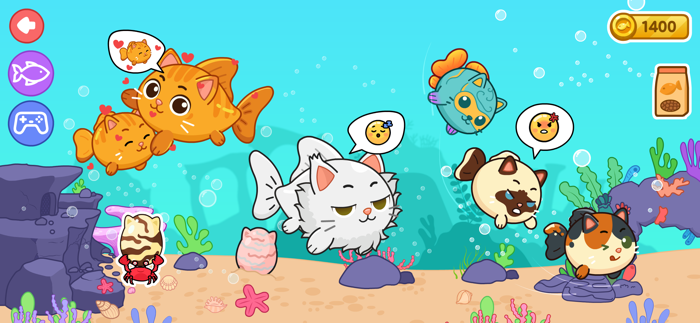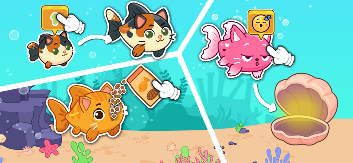 首先孵化鱼蛋,将新的可爱动物带入你的宠物店。看着小猫和鲶鱼们成长进化。你需要喂养它们,为它们梳理毛发,并在水族馆世界里为它们打造一个完美的家。你越照顾它们,它们就会越快乐!