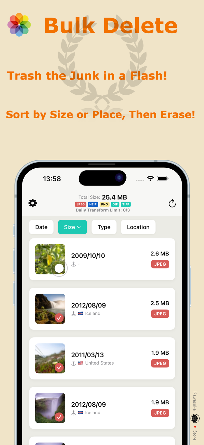 DelTransPhoto是一款强大的照片格式转换器及容量缩减应用,可帮iPhone节省存储空间。它能轻松转换图像格式,如将HEIF转为JPEG、PNG转为HEIF以压缩文件大小或提升跨平台兼容性;转换时可灵活控制质量与大小;能单独或批量删除照片快速释放空间,且无格式限制;还支持智能筛选与排序,一键按格式展示图片并按大小、类型、位置排序。