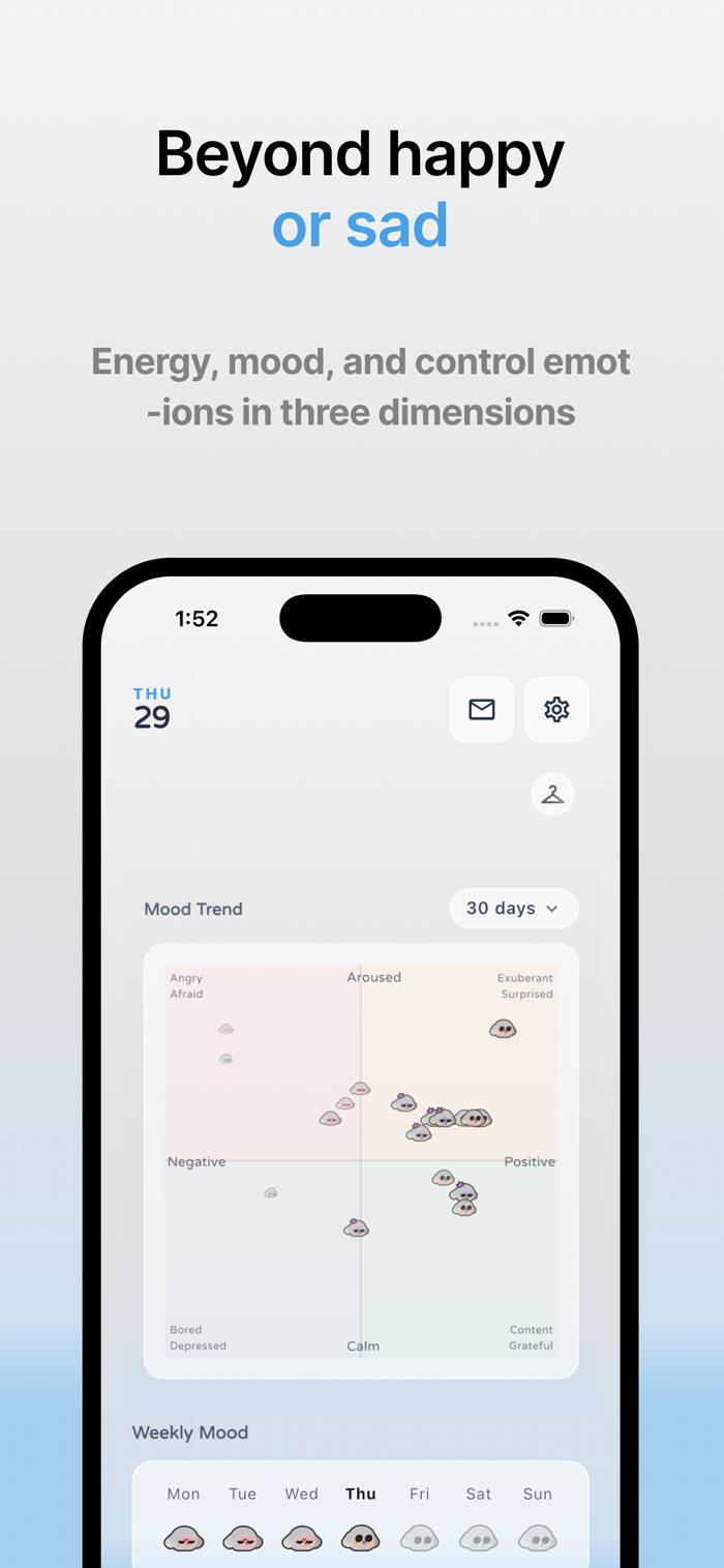 看到你的感受以3D形式呈现——活力、情绪和掌控力。点击任何一点就能重温那天。