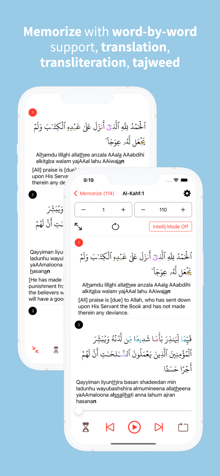 The Hifz companion app helps you easily memorize the Holy Quran. It's not just for memorization but a complete guide with exclusive tools. The IntelliJ Mode automates learning, building verse sets, repeating, and connecting new with previous ones. Features include smart memorization & revision with auto-repetition, custom delays, and a revision dashboard, free Mushaf options, premium audio of over 20 reciters, and study tools like Ibn Kathir Tafsir, word-by-word translation, and Tajweed highlighting.