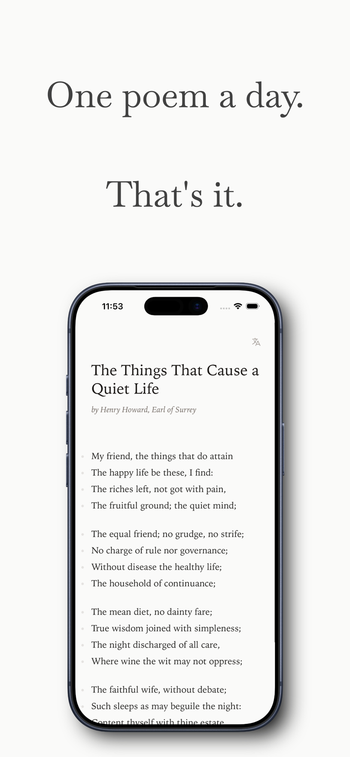 That's literally the whole idea. One poem per day, presented on a clean, quiet screen that feels more like a page from a good book than an app. No feeds, no accounts, no subscriptions. You read, you close it, you get on with your day.