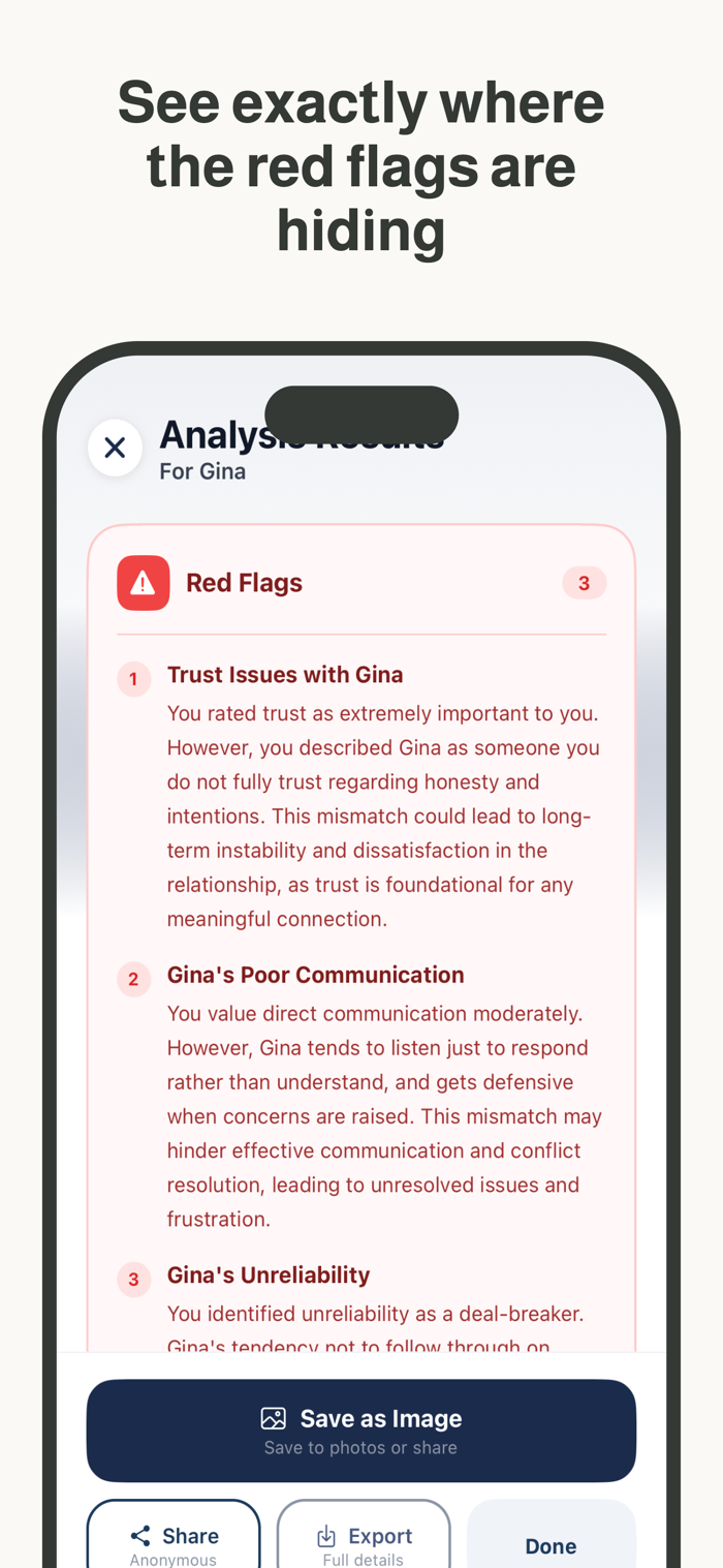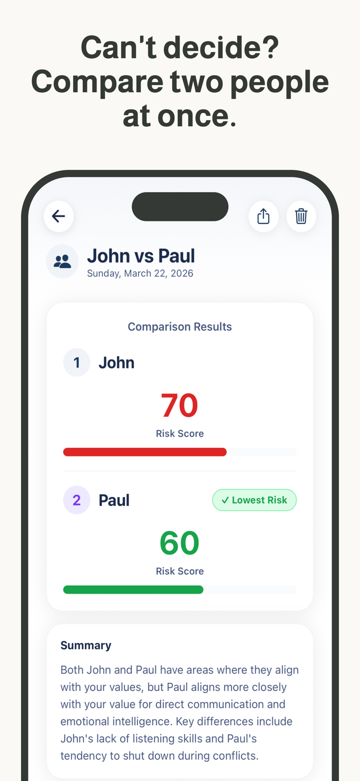 Polly是一款由人工智能驱动的兼容性和关系风险应用程序,利用成熟关系框架和行为分析,生成兼容性风险评分,揭示关系中的契合点、摩擦点及长期潜力。它能分析性格与兼容性匹配、共同价值观、沟通风格、情感行为模式、隐藏风险等,为用户提供关系的客观AI解读,帮助用户避免错付时间,快速找到契合关系,让人不再过度思考,而是清晰了解关系状况。
