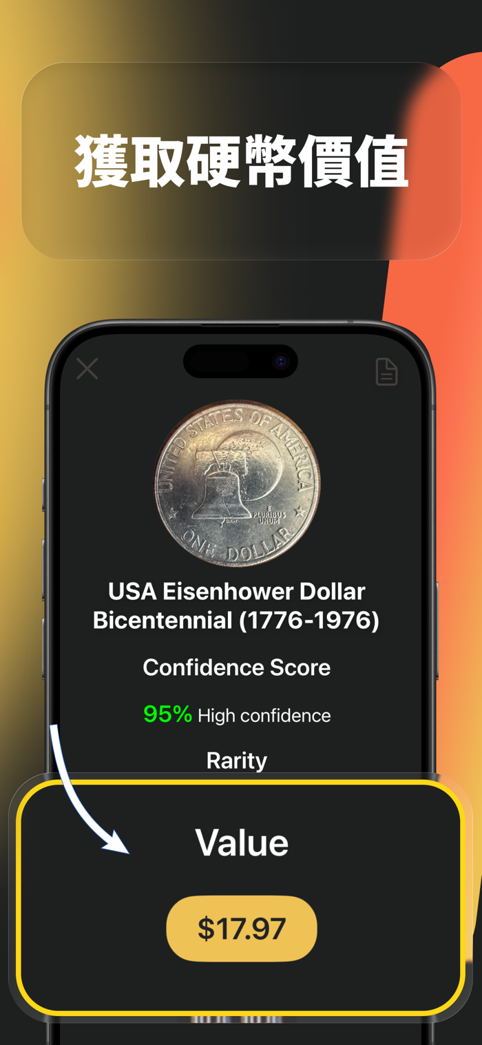 拍摄任何硬币的照片,快速准确地识别。查看硬币的名称、原产国、年份、面值和详细描述。