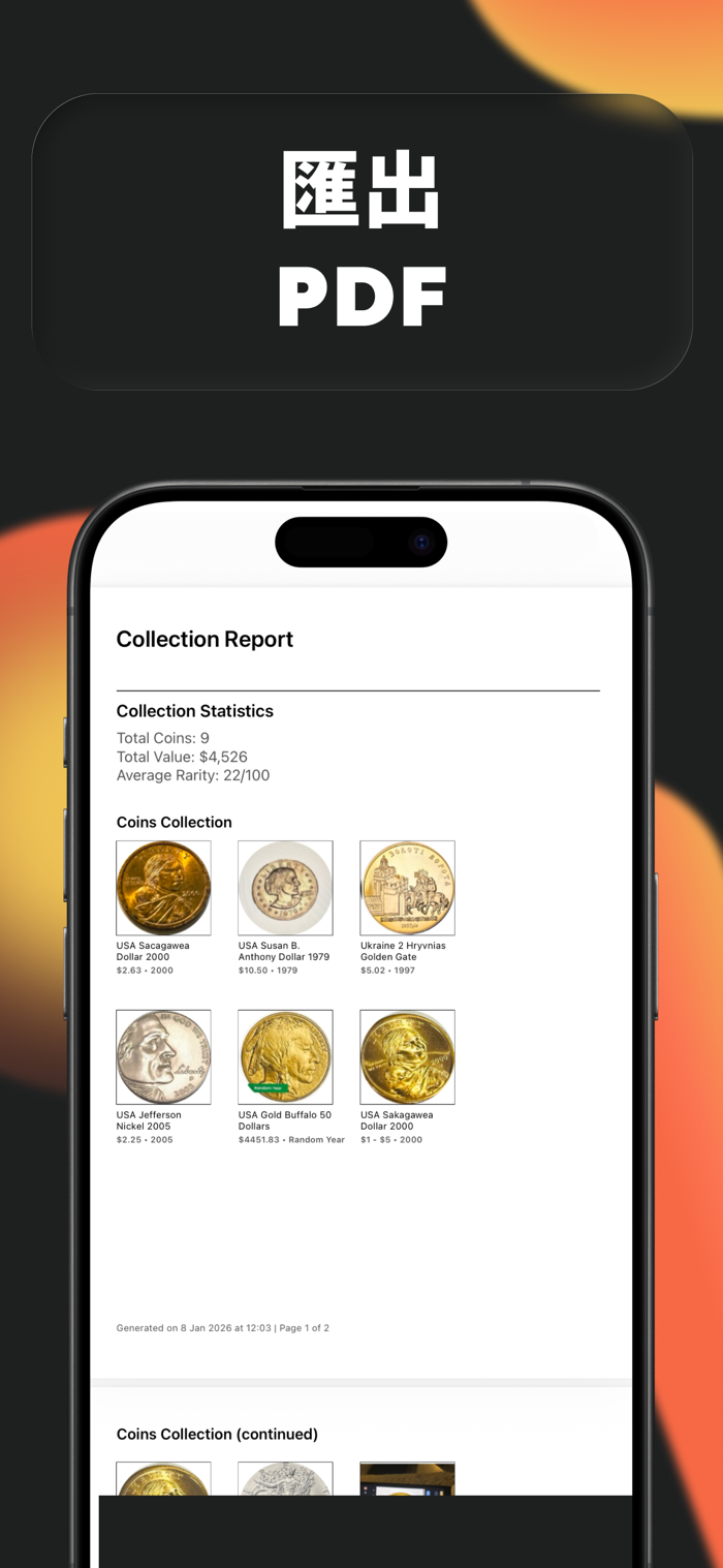 导出单个硬币或整个收藏的专业PDF报告。适合分享、记录或存档。
