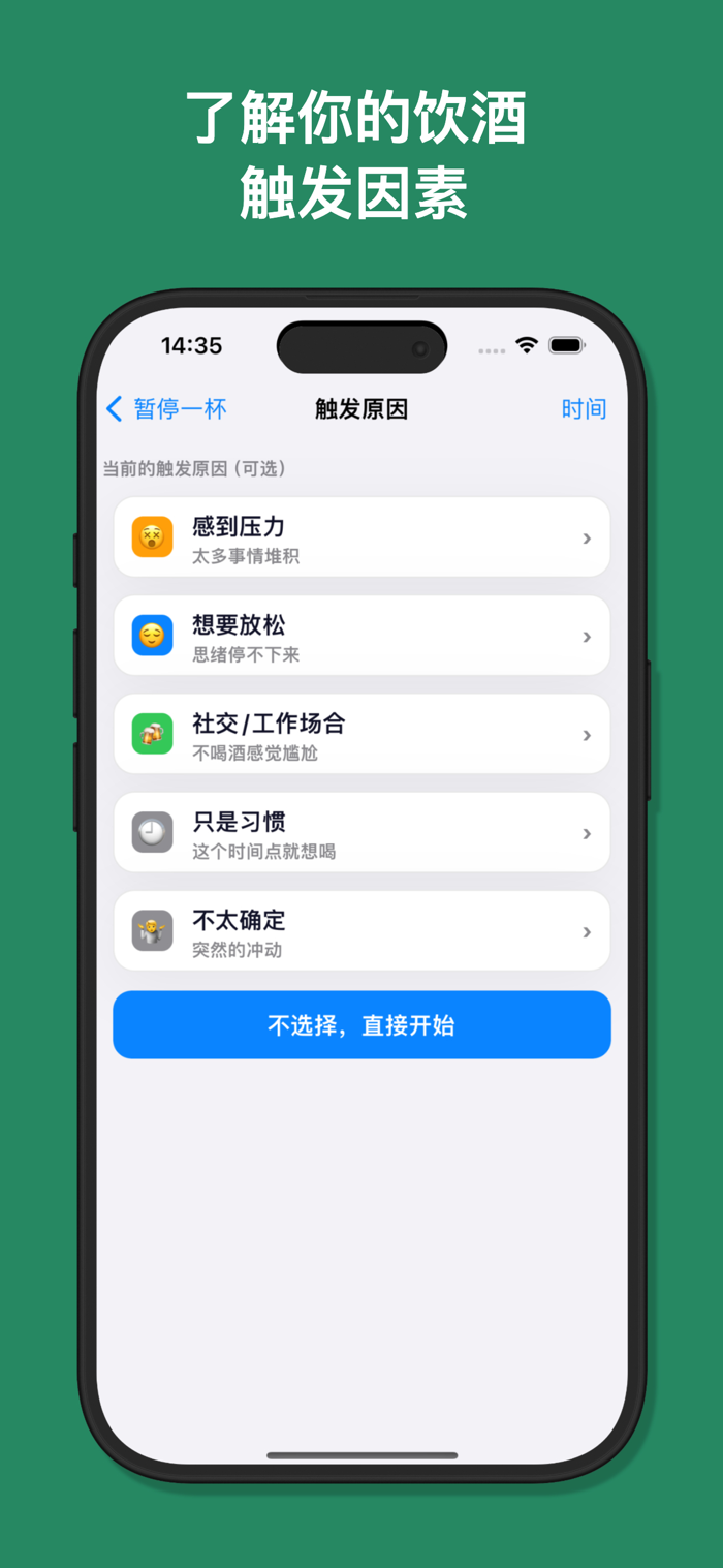 它帮助你暂停,跳过一杯 —— 无连胜记录,无羞愧感,也不用承受永久戒酒压力。