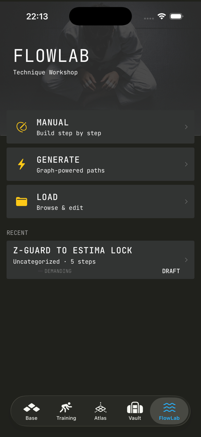 Create, generate, or load technique sequences in an interactive workshop. Chain positions, movements, and submissions into named flows. Pin start or end positions and let the graph suggest paths you haven't considered. Your personal technique laboratory.