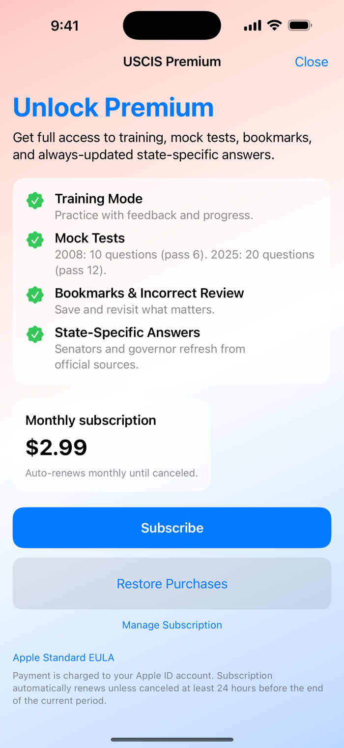 轻松选择您所在的州,以获取针对特定州问题的最新答案,例如确定您当地的参议员、州长和州首府。我们的应用程序会根据您的居住地调整学习材料,让您随时做好准备。