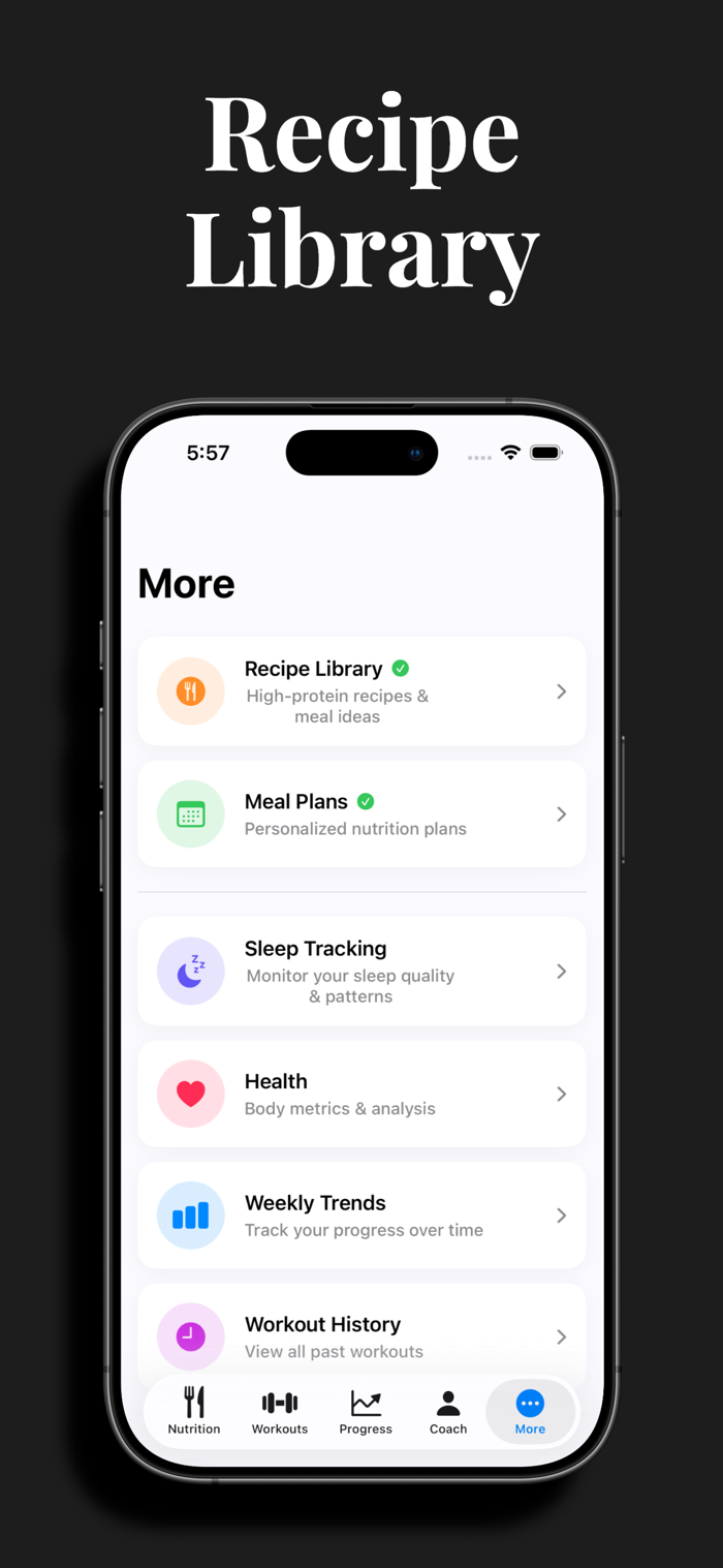 Complete a quick onboarding survey and receive custom calorie targets, macro splits, training splits, and AI-generated program recommendations tailored to your body, goals, and lifestyle.