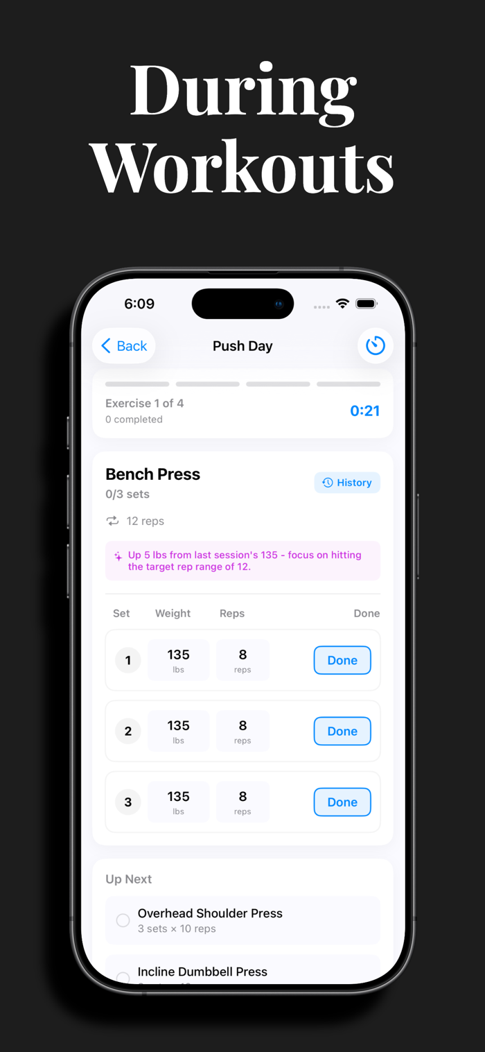 - Smart weight suggestions and progressive overload tracking