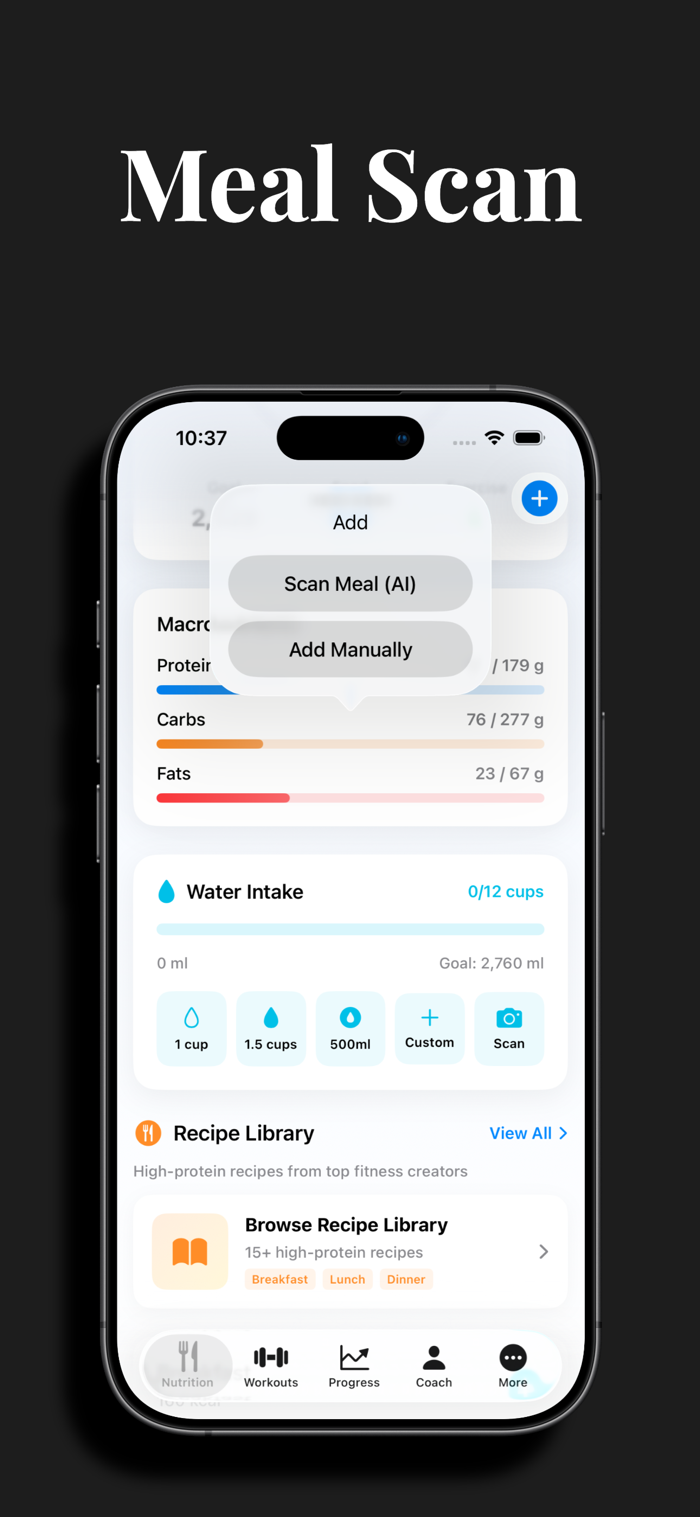Log meals with a quick tap or scan food with your camera for instant calorie and macro estimates. Track water intake with smart glass scanning, browse a built-in recipe library, and generate personalized meal plans tailored to your dietary preferences and goals.