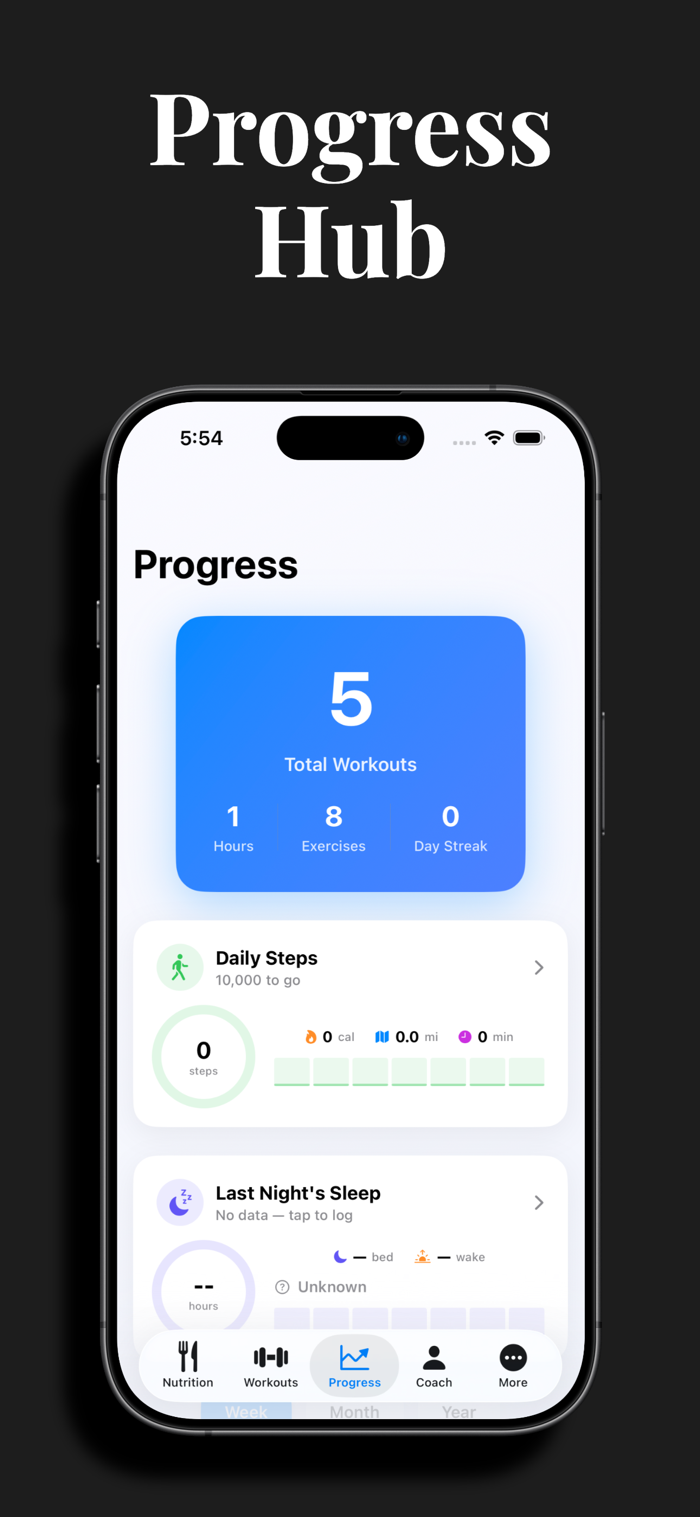 Visualize your fitness journey with weight trends, body measurements, workout volume charts, step tracking, and sleep monitoring — all synced with Apple Health.