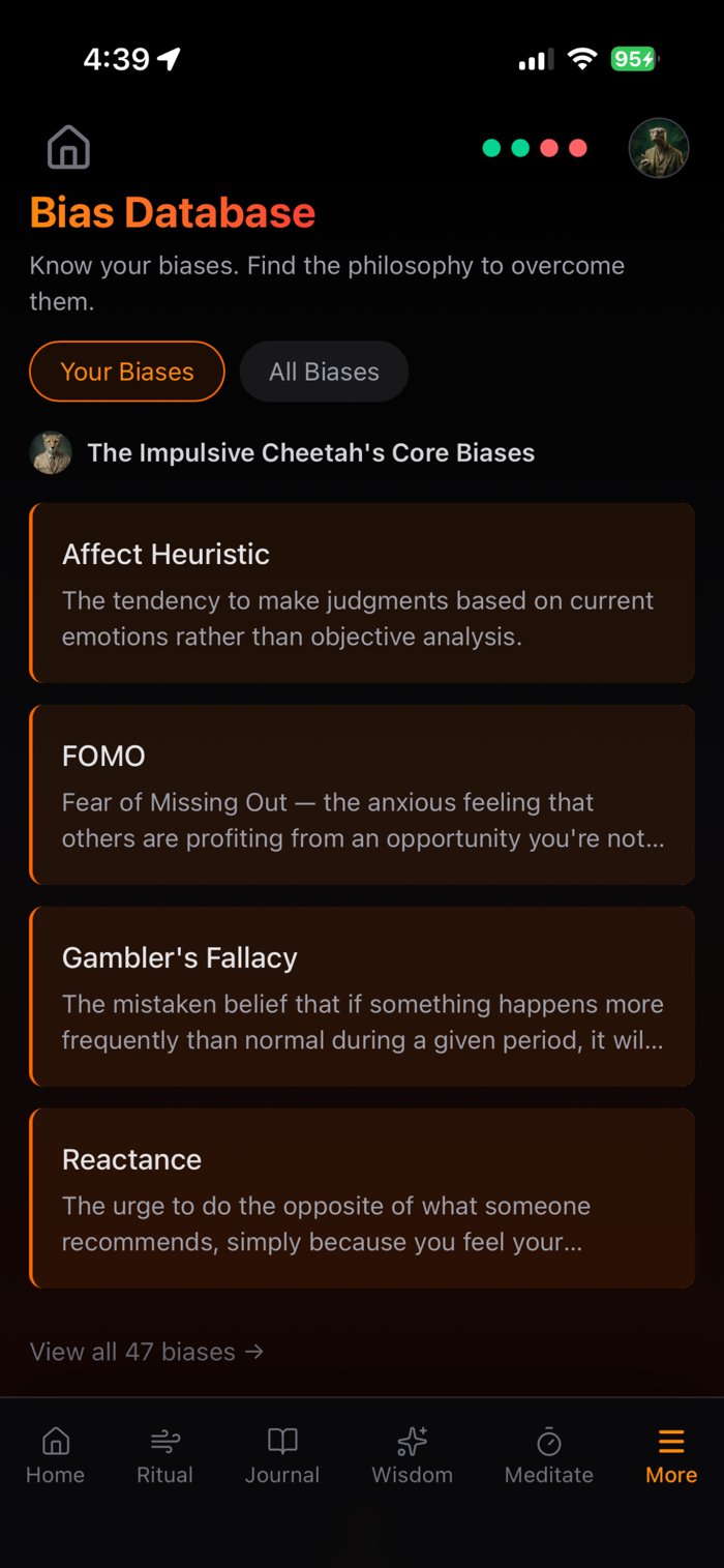 Take a 25-question quiz to discover which of 13 investor animals you really are: from the Panicking Deer who sells every dip to the Overconfident Gorilla who doubles down after a lucky streak. Then let your animal's philosophical mentor coach you out of your worst instincts and into financial independence for you and your family.
