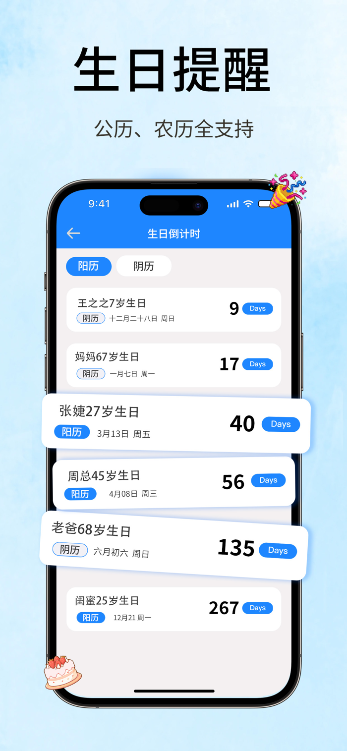 • 生日提醒:为自己或亲友记录生日信息,清楚掌握时间变化,祝福与准备从容不慌。