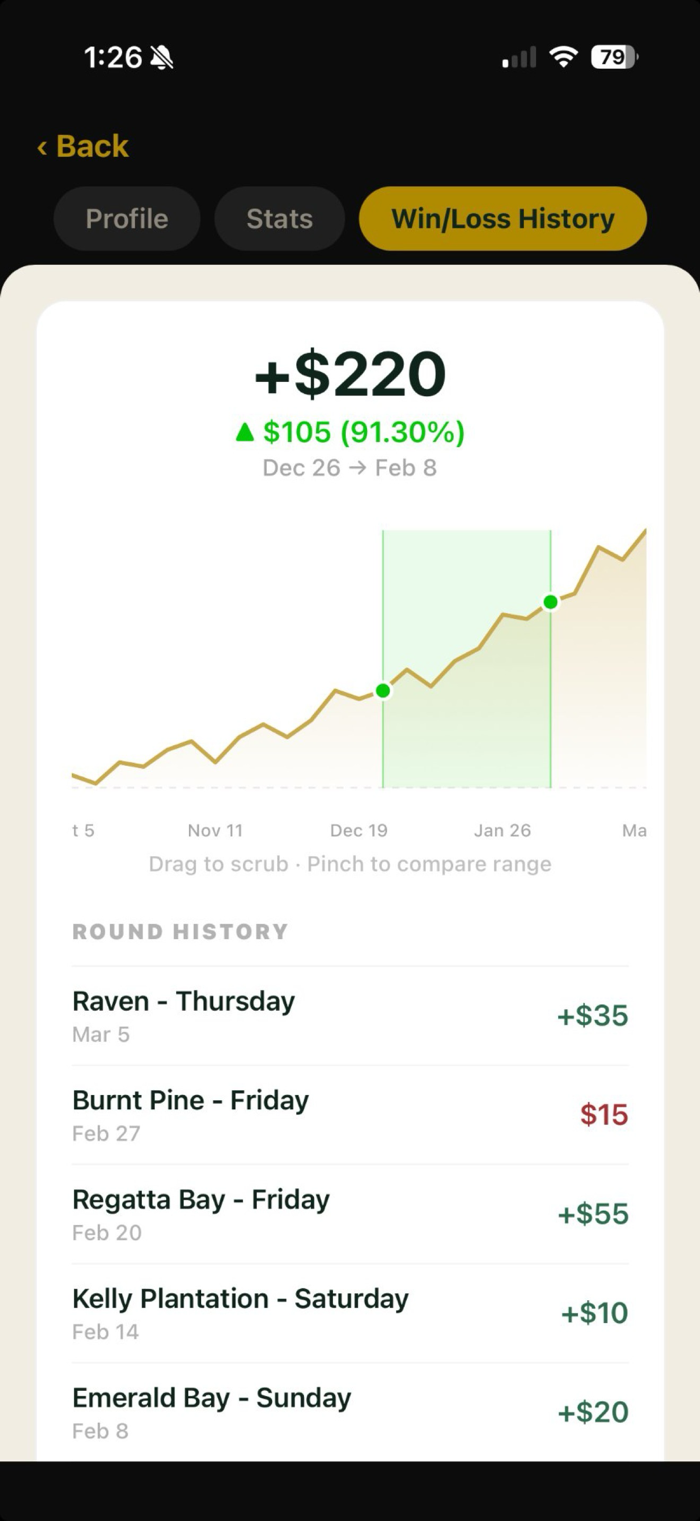 See your net position, skins won, active presses, and round progress right on your Lock Screen and Dynamic Island — without opening the app. MatchRoom updates in real time as scores are entered, so you always know where you stand at a glance.