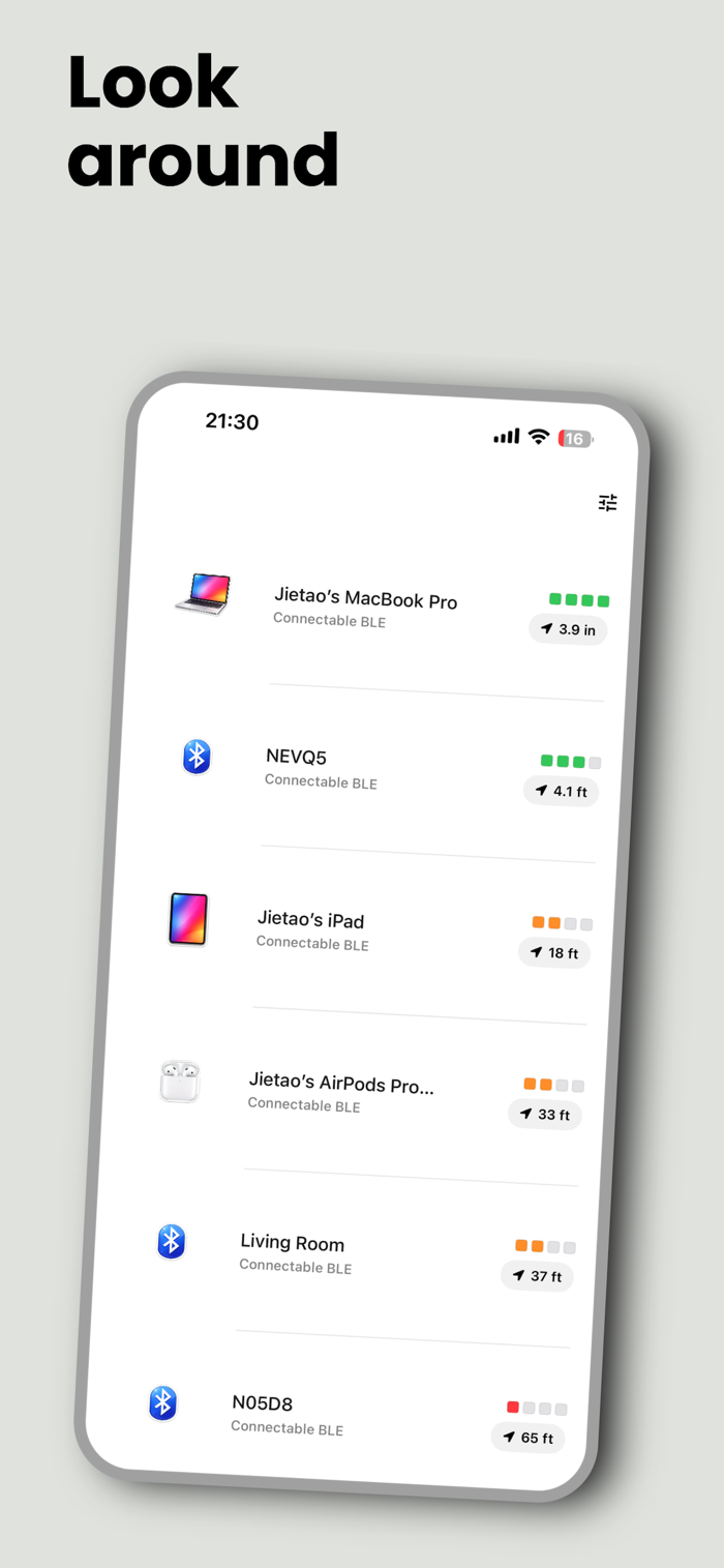 Bluetooth Finder and Locator可帮你快速找回丢失的蓝牙设备。用iPhone或iPad扫描附近蓝牙设备,通过信号强度指引定位。能用于找回日常使用的如耳麦、音箱、智能手表等各类蓝牙设备。只需启动应用,按指示靠近丢失设备即可。使用条款:https://www.apple.com/legal/internet-services/itunes/dev/stdeula/ 隐私政策:https://medium.com/@jietaowu2014/bluetooth-finder-and-locator-d12977a94b88