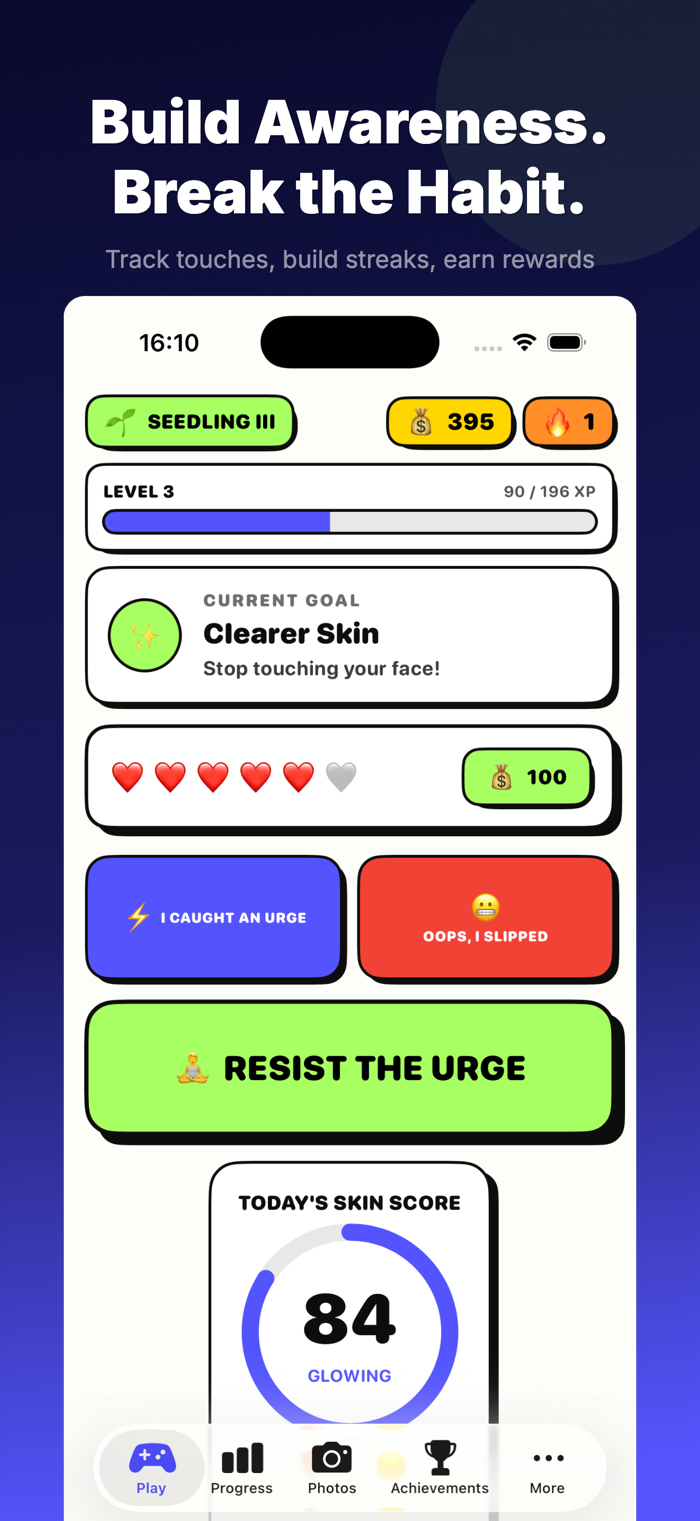 Whether you're dealing with breakouts, skin picking, or an unconscious habit you've tried to quit before — FaceQuest gives you awareness tools and a motivation system that works because it doesn't feel like work.