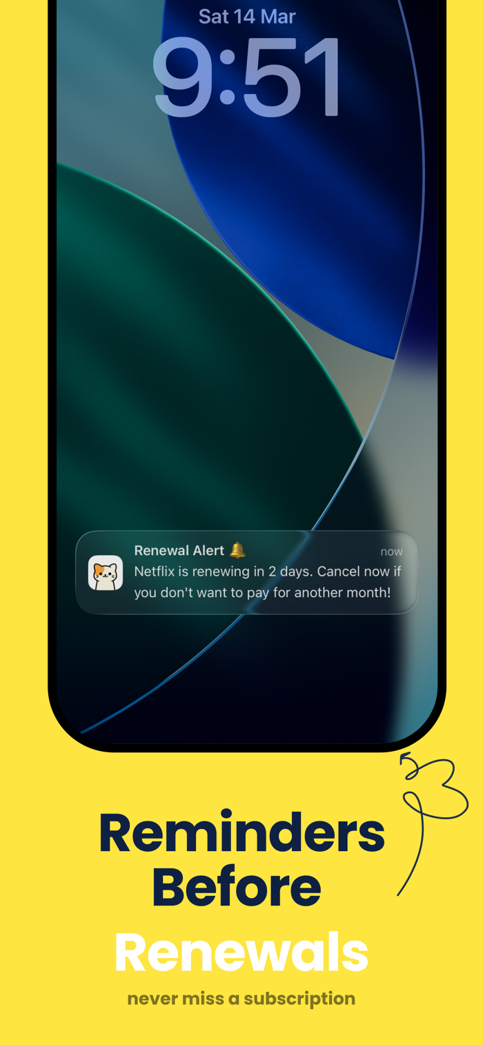 Get reminders before any subscription renews so you can decide whether to keep it or cancel. SubscriptionCat alerts you in advance, giving you time to act.
