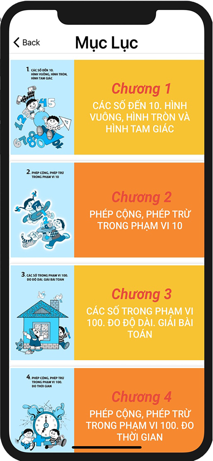 • TOÁN LỚP 1 hiển thị nội dung của từng bài học trong sách.
