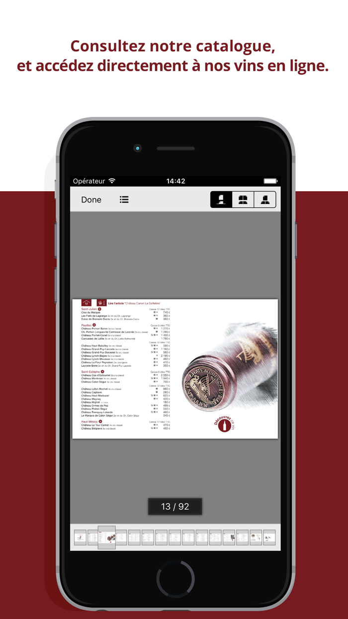 Millésima Catalogue应用程序可让您在智能手机或平板电脑上访问所有内容。通过该应用,能进入互动目录、观看视频、浏览博客文章,还可接入社交网络,所有内容汇聚于一处。