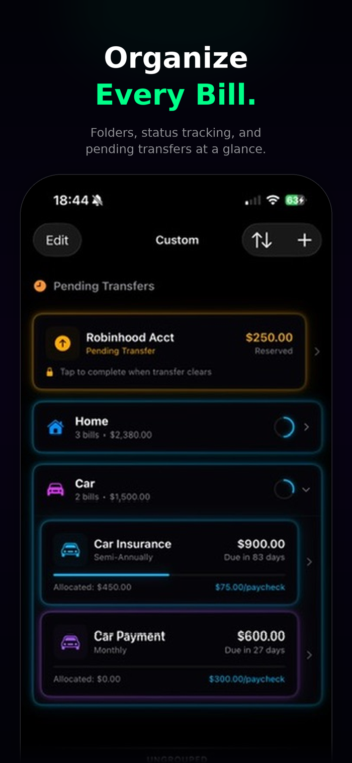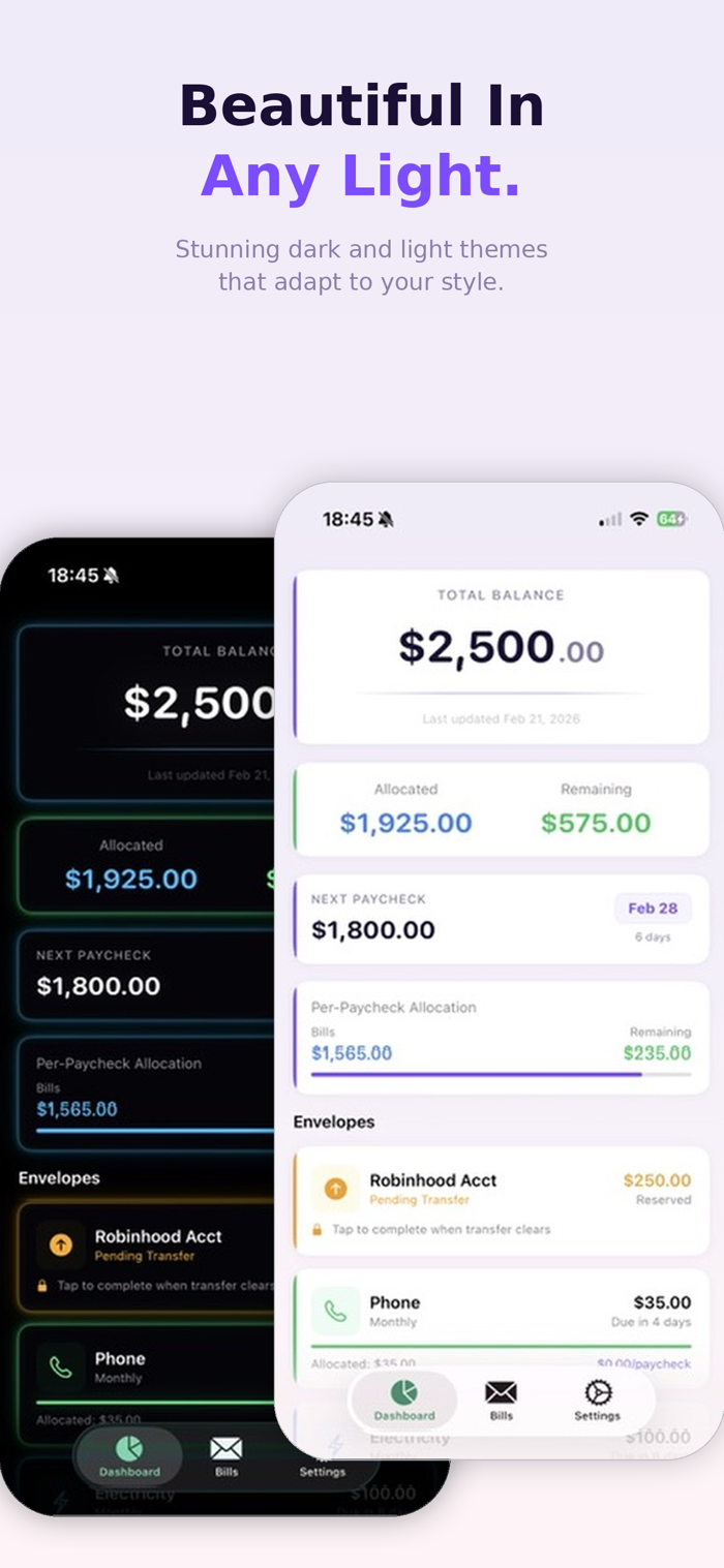 Transfers don't always clear instantly. Enveloop lets you log pending transfers so your balances reflect money that's already spoken for — even if it hasn't left your account yet. No more mental math, no more accidentally spending money that's in transit. You see exactly what's actually available right now.