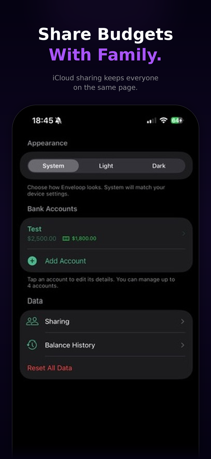 Share any budget account with your spouse, partner, or family members. They'll see the same envelopes and balances you do — updated in real time. Share your household budget with your spouse and your vacation fund with a friend. You choose who sees what, and you control the access. Sharing works entirely through iCloud. No sign-ups, no servers, no middleman.