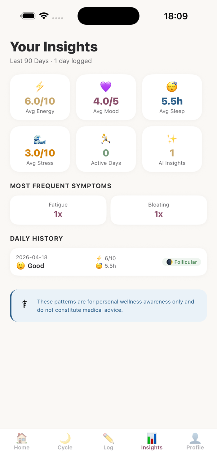 At the end of every cycle, Vera's AI reviews all your logged data to surface recurring patterns by phase, highlight what's improving, and prepare you for the cycle ahead.
