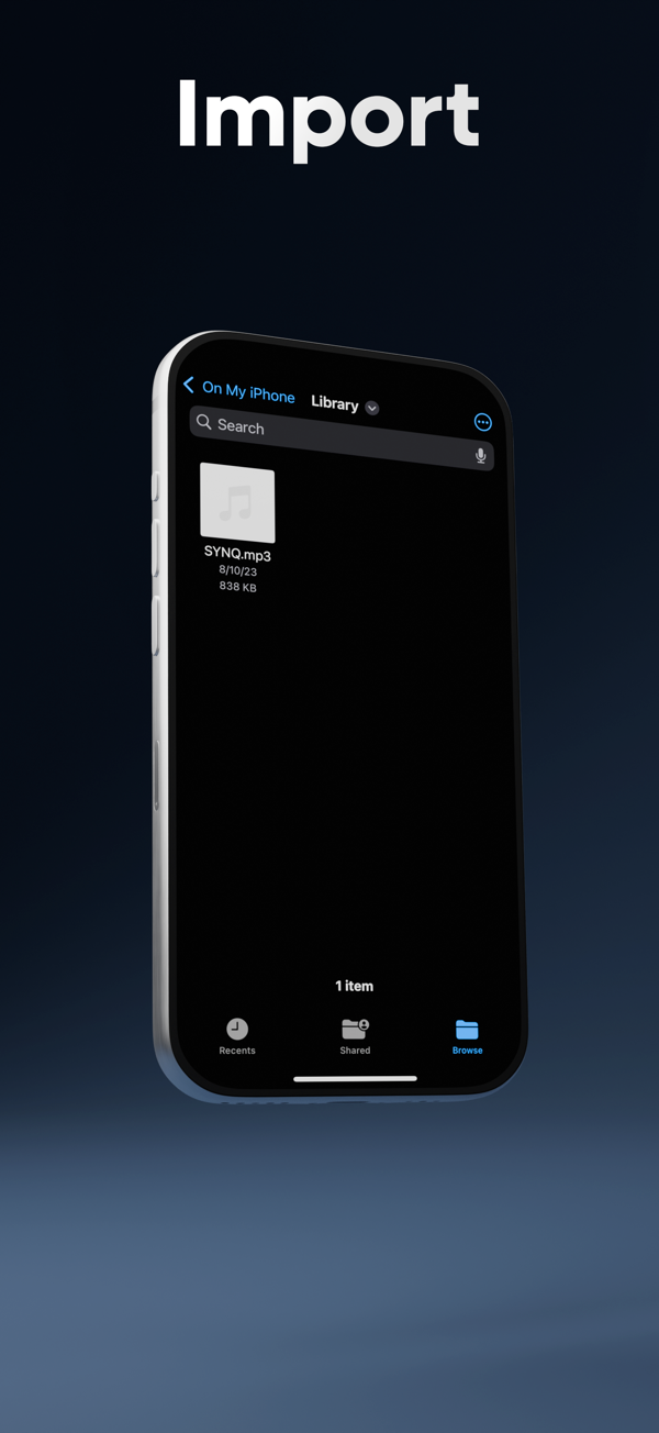 You can import music from the Files app. You can also transfer them from any device on your network straight into the app! Once the files are in SYNQ, you can edit their metadata (song title, artists, albums, image, etc.). Finally, you can export your edited files to listen in apps like Spotify, or you can play them in SYNQ!