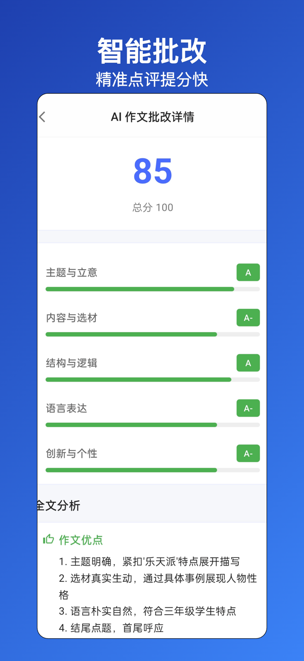 多维度专业评分,提供好词好句润色建议,您的贴身语文私教。