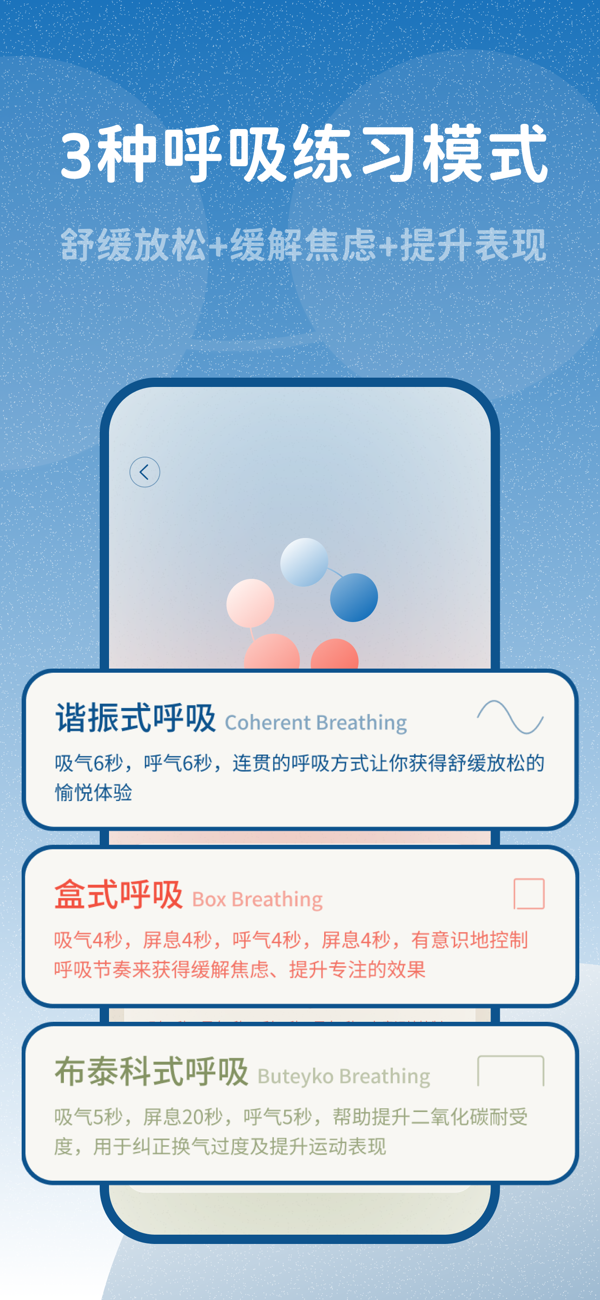 1. 3种呼吸训练模式:谐振式呼吸、盒式呼吸、布泰科呼吸