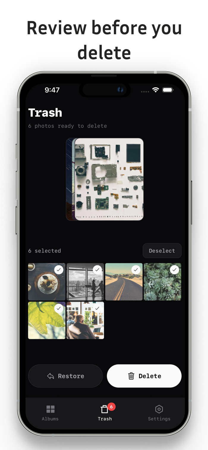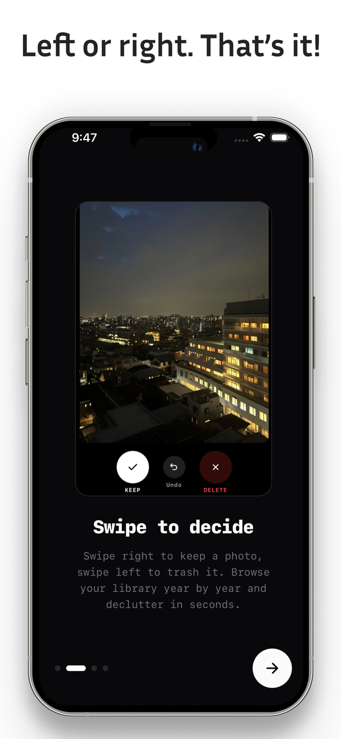Browse your photos year by year. Swipe right to keep, left to trash. Review everything before deleting — nothing is removed without your confirmation.