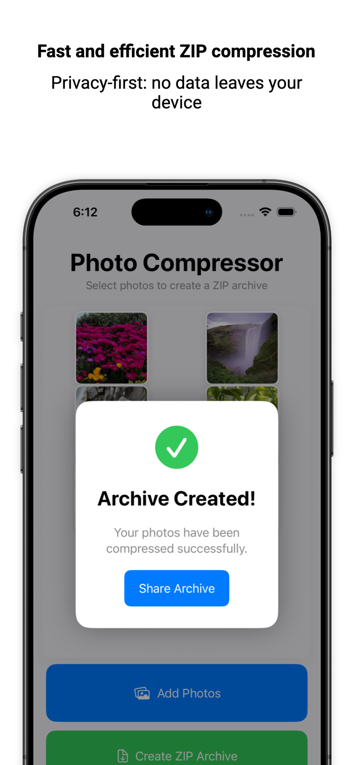 With Photo to ZIP, you can select multiple photos from your gallery, compress them into a single ZIP archive, and share it anywhere – perfect for backups, email, or quick transfers.