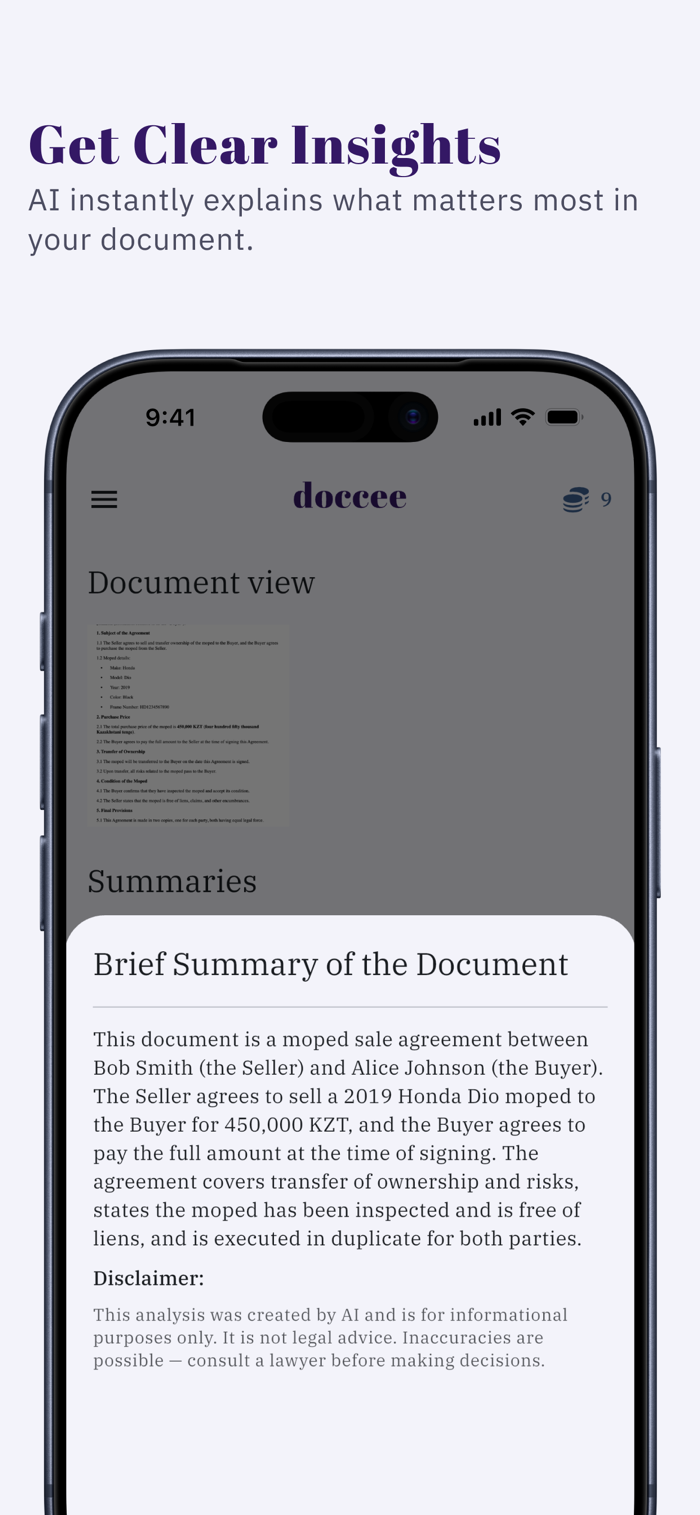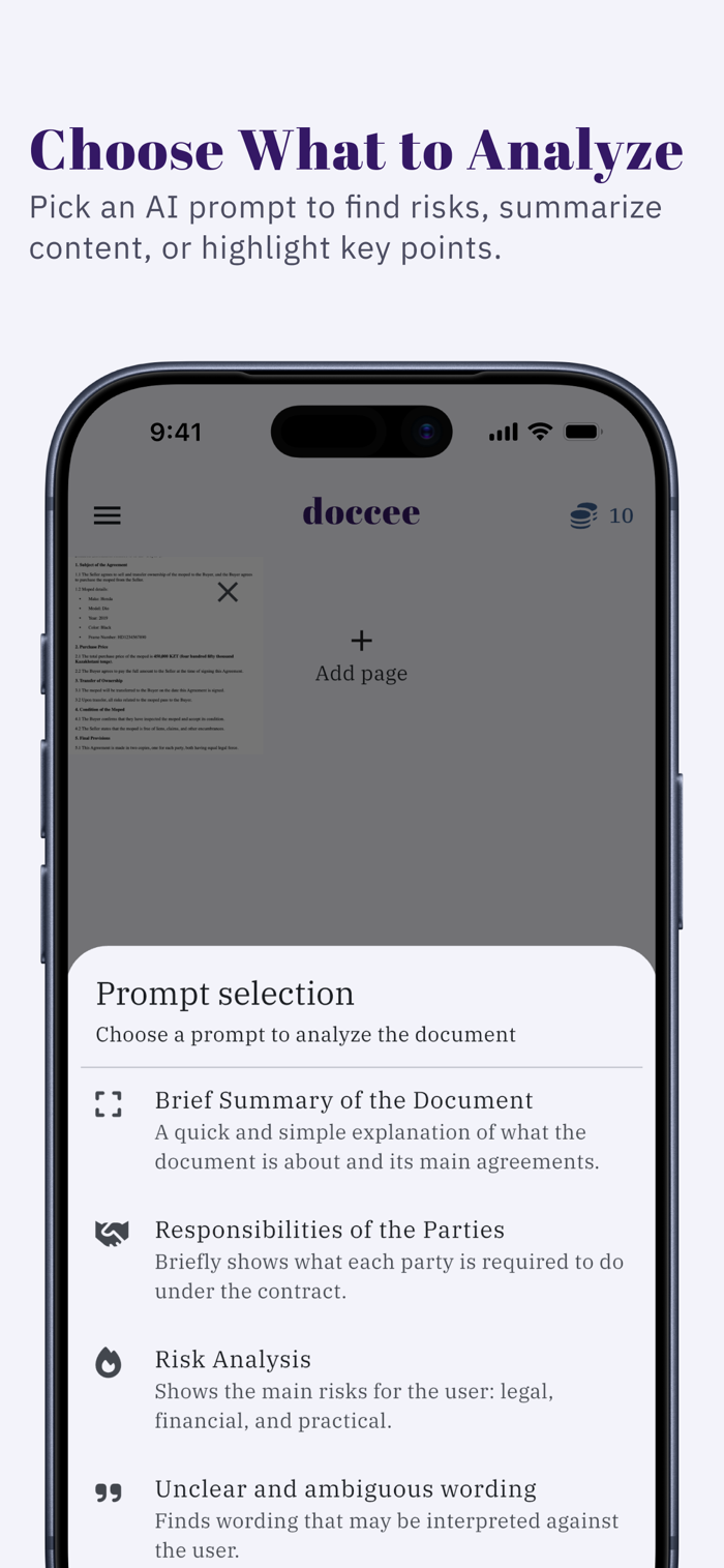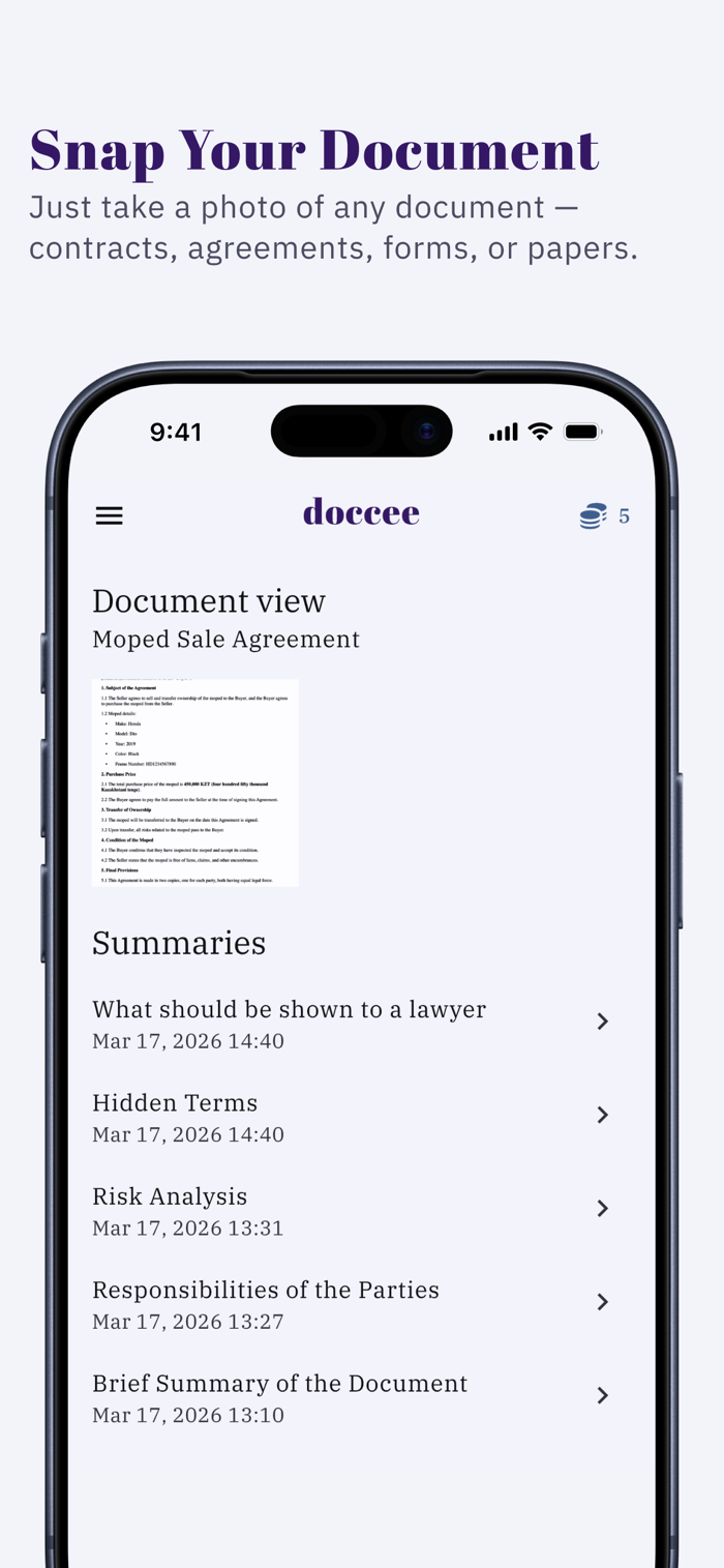 Doccee帮助用户在签署文件前快速理解合同、协议等重要文档。只需拍照或上传文件,就能立即看到关键点与总结、潜在风险及隐藏条款、应知晓的重要义务。无论是租赁协议、自由职业合同还是其他法律文件,它都能助您避免代价高昂的错误,无需法律知识,几秒即可明白关键内容。
