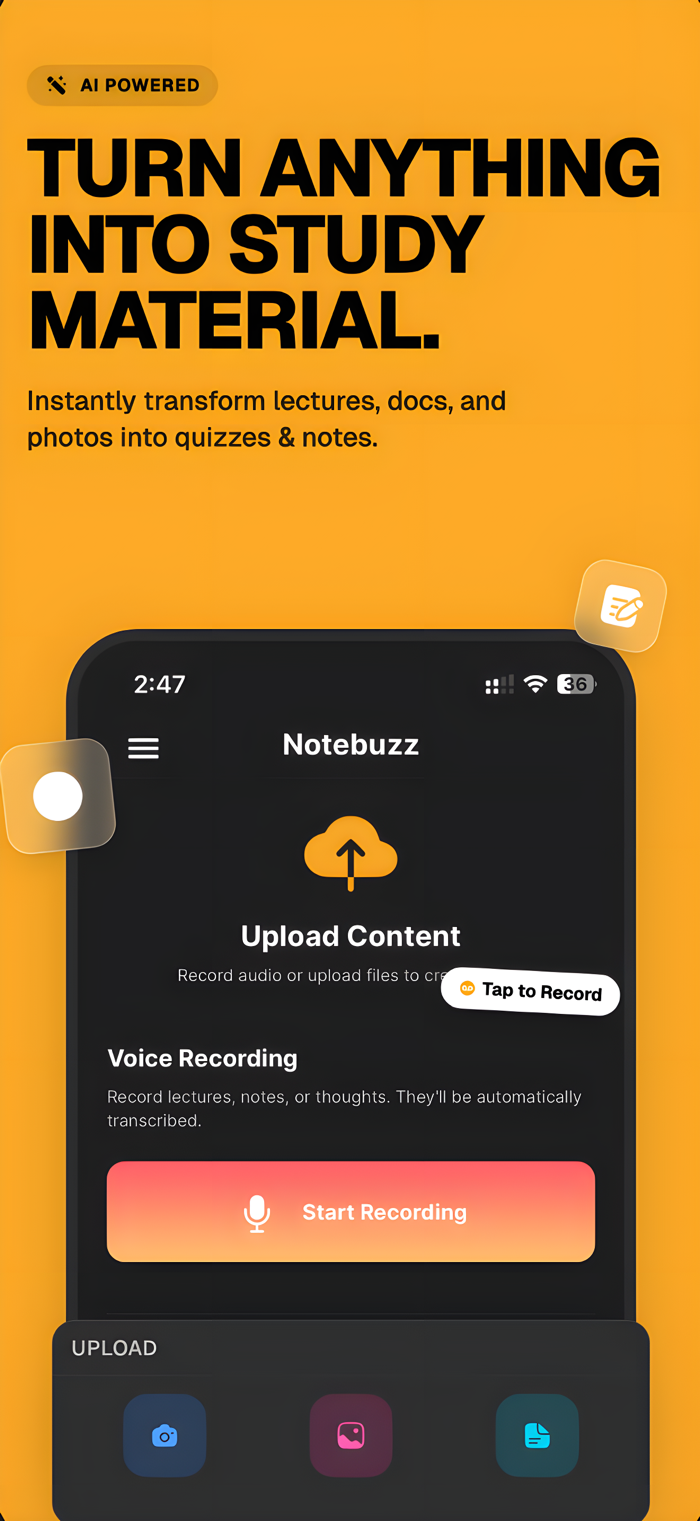 Notebuzz是一款由AI驱动的一体化学习应用程序,能帮你更快掌握任何学科。它可将笔记、文档和讲座录音瞬间转化为有条理的抽认卡、测验和学习指南。能随时随地捕捉知识,通过拍照、上传文档或录音实现;具备AI驱动的抽认卡生成功能,自动转化无需手动录入;有测验模式,用AI生成的选择题测试知识,答错自动安排复习;还有智能复习系统,按间隔重复算法安排有挑战性的材料,让学习更高效。