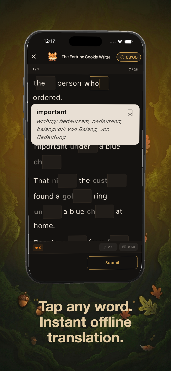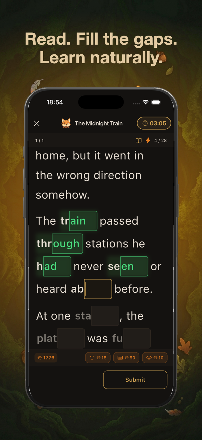 你将阅读一篇引人入胜的真实文章。特定单词的后半部分会被隐藏。通过分析周围的上下文,你的大脑会进行逻辑推理并推断出缺失的字母。不再需要死记硬背孤立的单词表!你将自然地掌握词汇和语法在真实世界中的实际用法。
