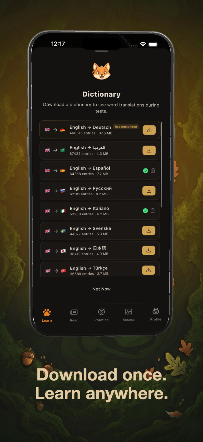 • 离线词典与语境记忆卡:遇到不认识的单词?只需轻触即可。内置的离线词典无需网络即可立刻显示其在16种语言中的含义(甚至能识别变位动词)。保存单词,稍后使用包含你最初阅读该单词时的原句的记忆卡进行复习。