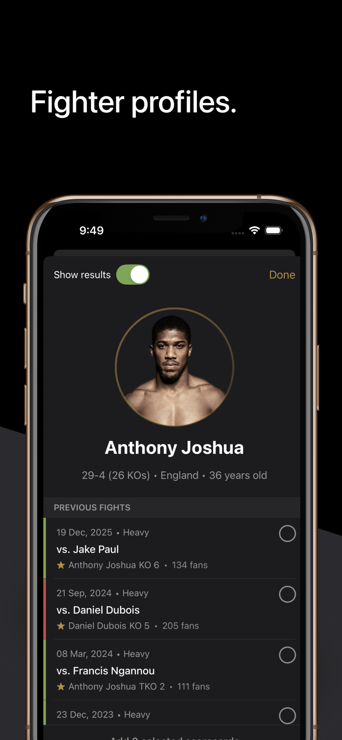 Fight Scores is your essential companion to the weekend's boxing viewing. Whether you're in front of your tv or soaking up the atmosphere at a live event, Fight Scores invites you to take on the role of being a judge.