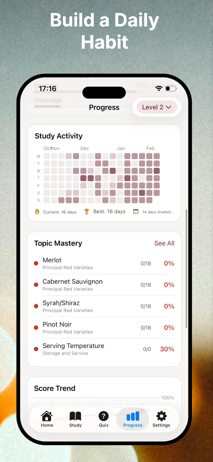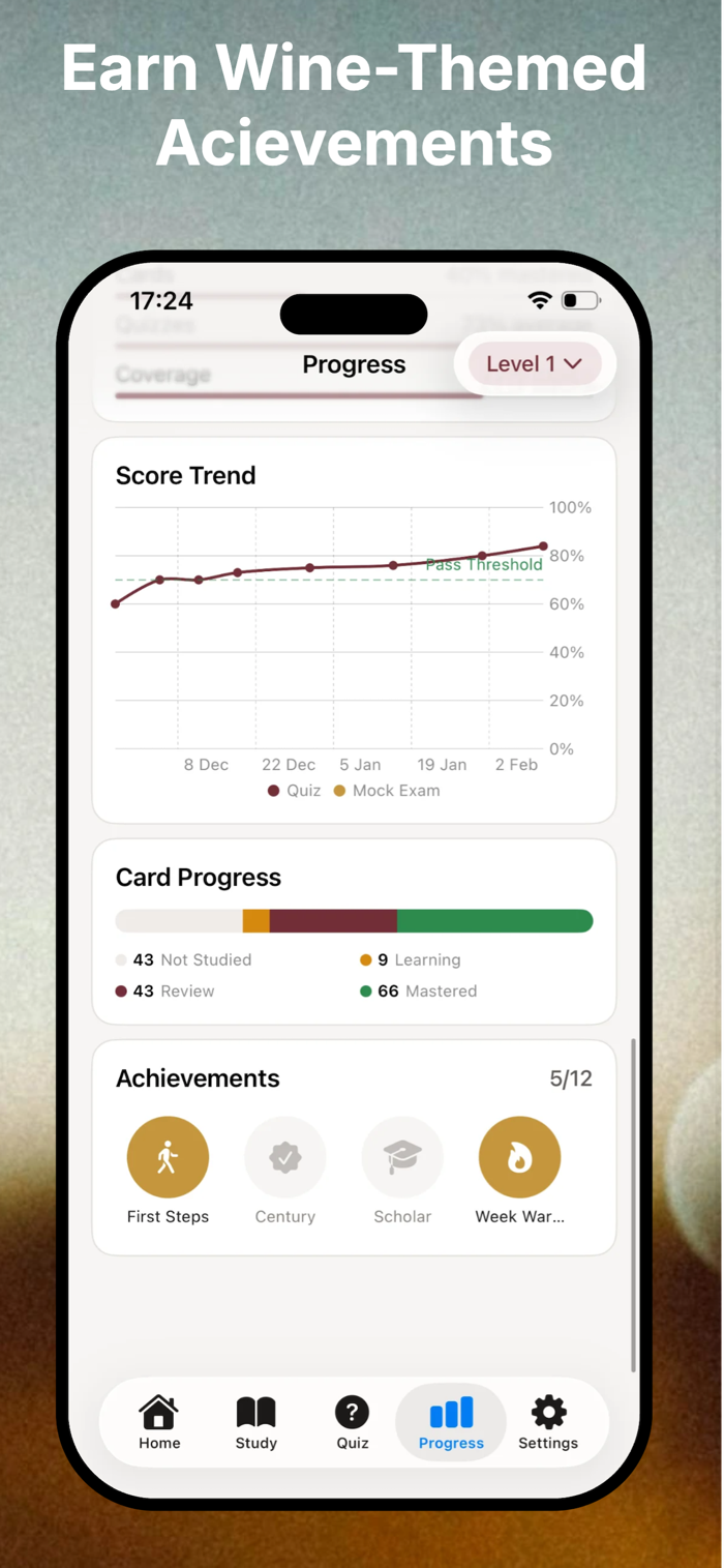 Stay motivated with wine-themed badges: "Scholar," "Perfect Score," "World Warrior." Build study streaks and master new modules.