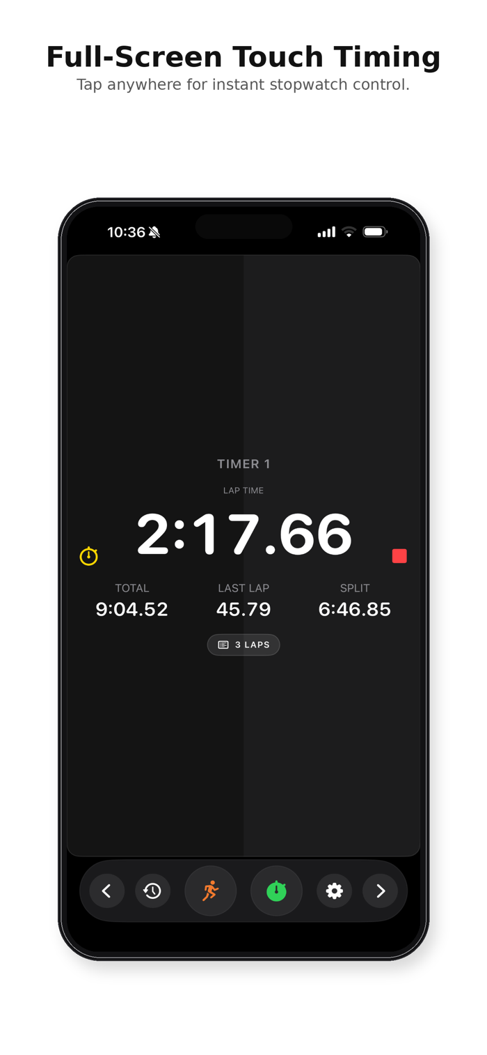 Trackside Stopwatch is a touch-first stopwatch built for track and cross country coaches who need fast, reliable timing at practice and on race day. With full-screen touch timing, multi-timer support, lap review, session history, and export tools, Trackside Stopwatch is designed to help coaches capture more accurate data with less friction.