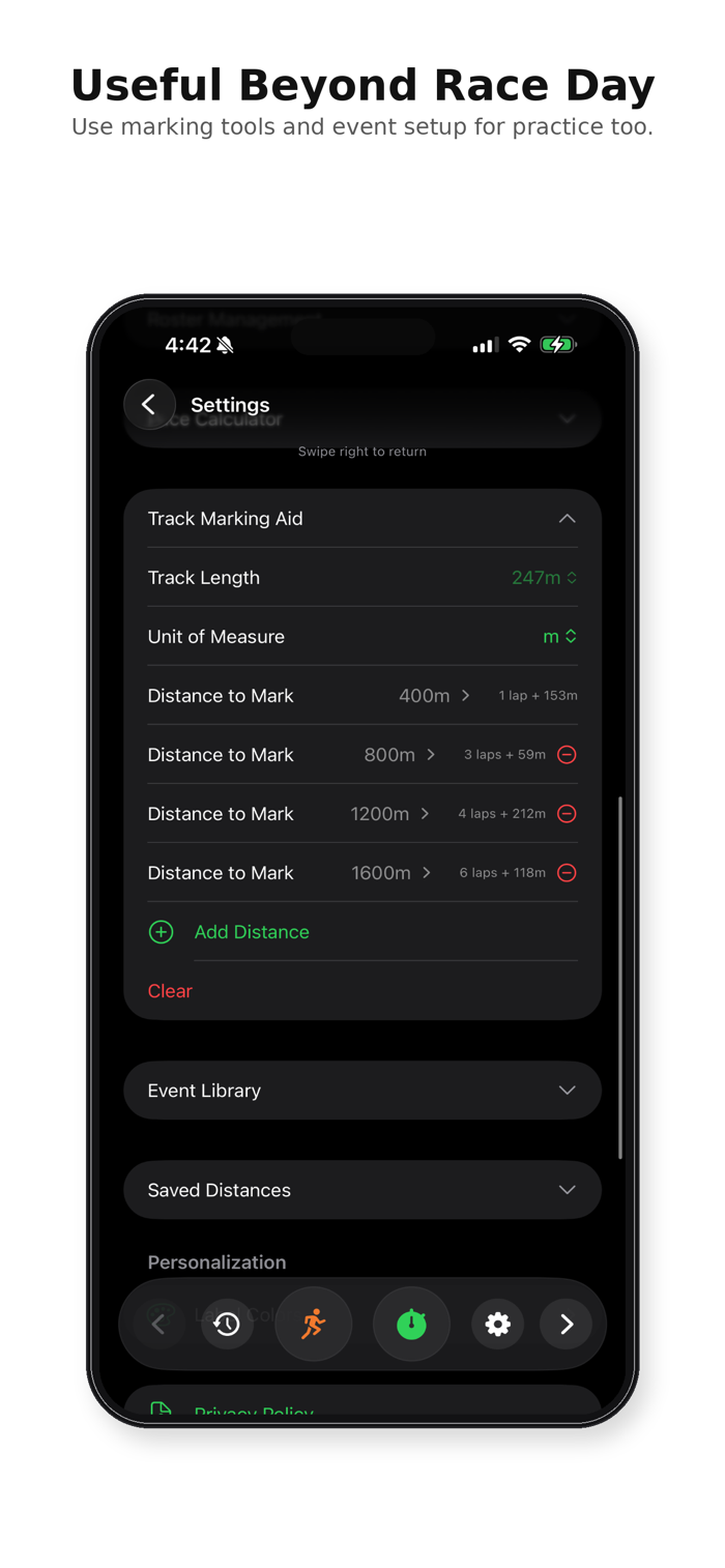 • Track marking aid for custom track lengths and practice setup