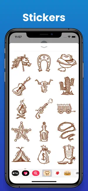 Cowboys - Wild West让日常交流更精彩,iMessage贴纸含超棒表情符号与贴纸,可混合创建自定义表情,有顶级高清图形,永久免费更新,无隐藏收费、广告及用户分析,一次付费终身享用,还有24/7客户支持。使用时轻点添加,按住拖放可置于气泡或照片上,贴纸能相互叠加,让聊天有趣。