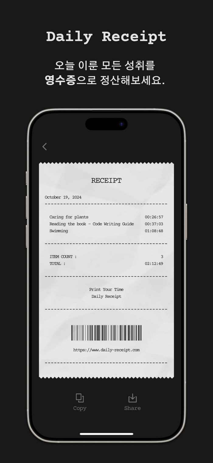 ■ 하루 영수증 Daily Receipt- 오늘 이룬 모든 성취를 영수증으로 남겨보세요.■ 영수증 저장하기- 할 일을 완료하고 성취감을 누리세요. ■ TODO 시간 기록- 투두를 눌러 시간을 효율적으로 관리할 수 있어요. ■ 월별 성취 기록- 한 달간의 성과를 한눈에 확인하세요.■ 주간 할 일 관리- 일주일 단위로 할 일을 추가하고 계획을 세우세요.