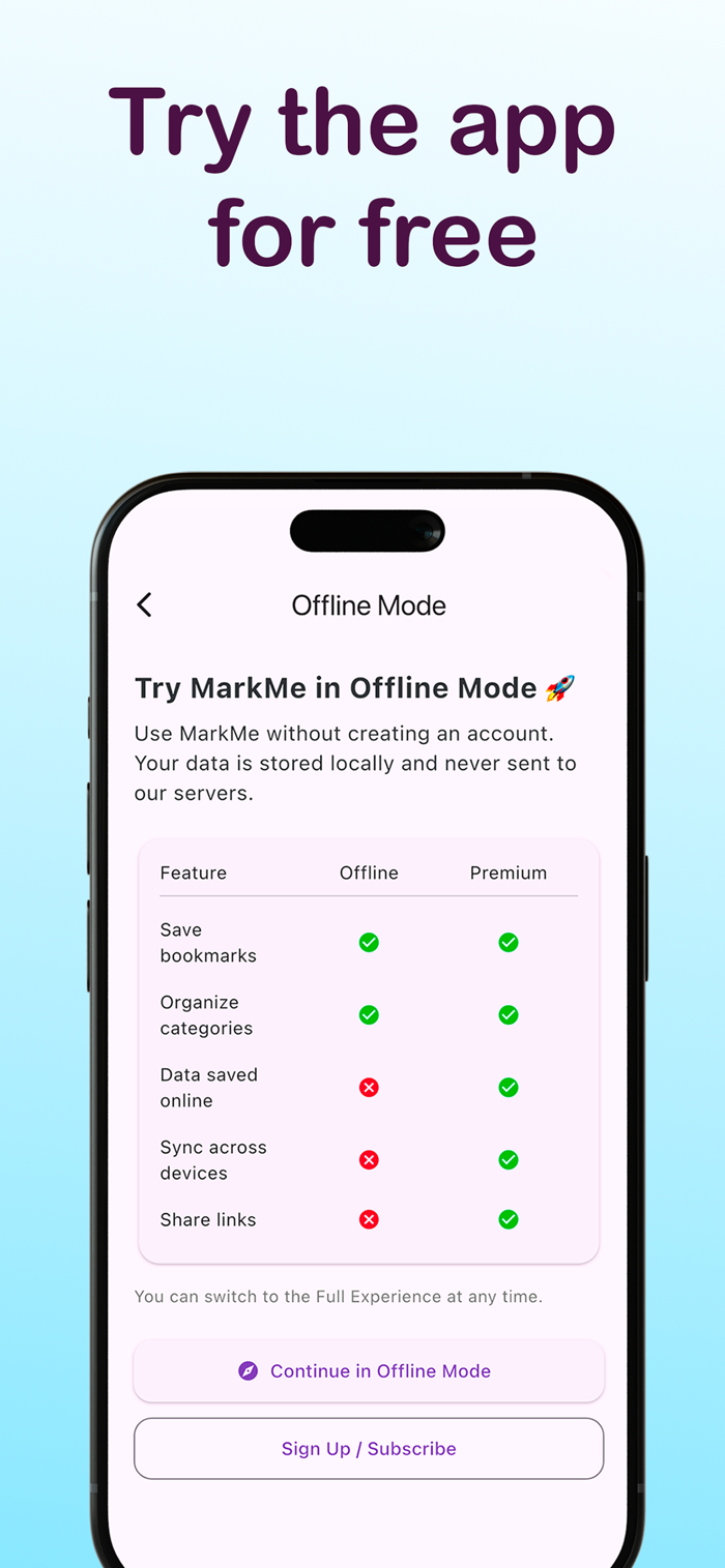 MarkMe是一款强大的书签应用,能快速简便地保存和整理收藏链接。它可秒存任何链接,按类别智能组织,支持离线访问。具备跨设备同步功能,能在iPhone、iPad和网页端使用。还能轻松分享或导出书签,有“稍后阅读”功能,且注重隐私保护,数据安全不售卖,适用于研究、提升效率、购物等场景。