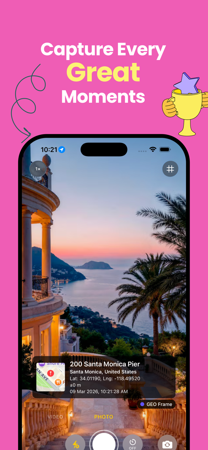 Capture photos instantly while GeoFrame automatically attaches location data.
