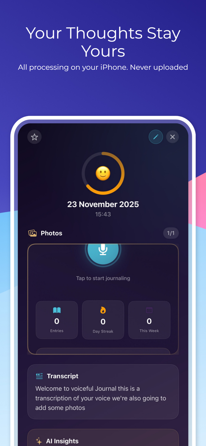Unlike other journaling apps, VoiceFlow processes everything on your device. Your entries never touch the cloud. No servers analyze your thoughts. No third parties see your data. Your journal is yours alone - as it should be.