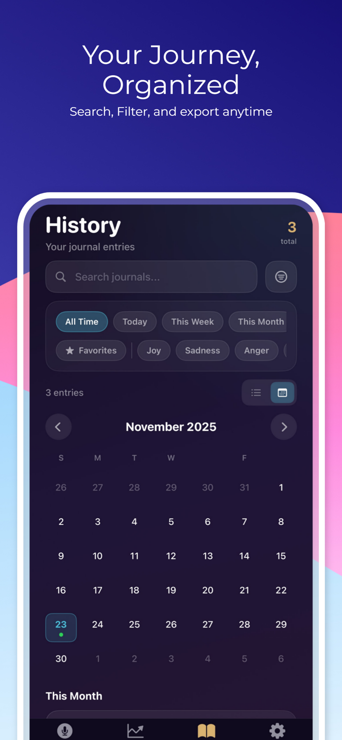 Skip the intimidating blank page. Just tap record and talk naturally about your day, feelings, or whatever's on your mind. Advanced speech recognition captures every word with remarkable accuracy.