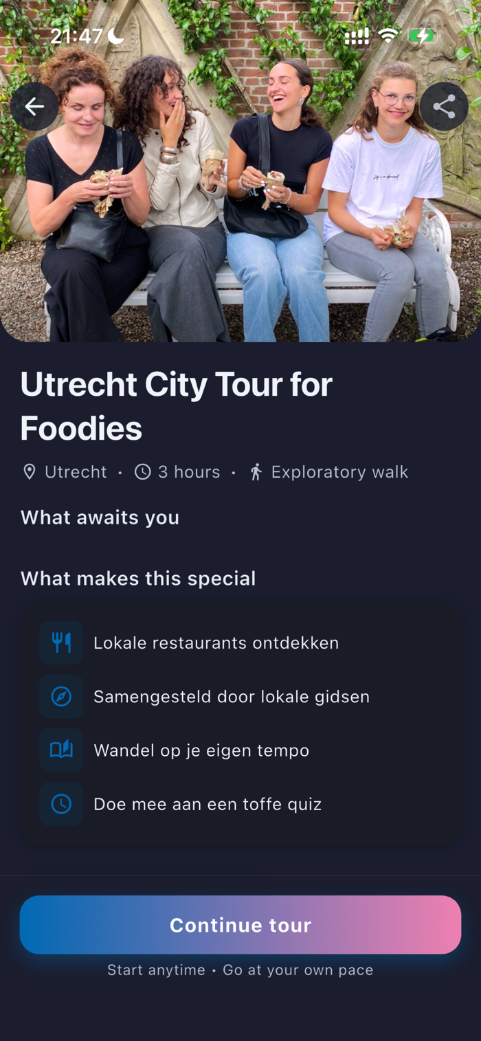 V for Food turns Utrecht's vegan food exploration into an interactive adventure. It offers self-guided walking tours of the city's vegan hotspots, combining storytelling, challenges, and culinary discoveries. Along the way, answer trivia, solve puzzles, do photo challenges, unlock location-based content, and watch videos. Invite friends to join in real-time, share codes or QR scan, compete on the leaderboard. Earn rewards for a complete and engaging experience perfect for various outings.